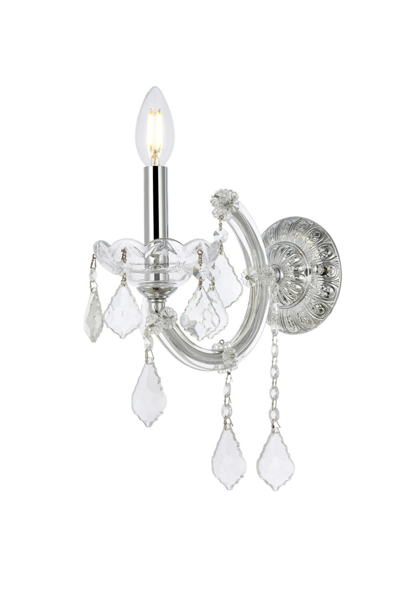 Give your foyer, hallway, or bathroom the royal treatment with the Maria Theresa collection wall sconces. Dazzling drop crystals in clear or golden teak shimmer amid glowing exposed bulbs. Gracefully arching glass-coated arms come in a range of finishes. A majestic display in a kaleidoscope of color combinations.