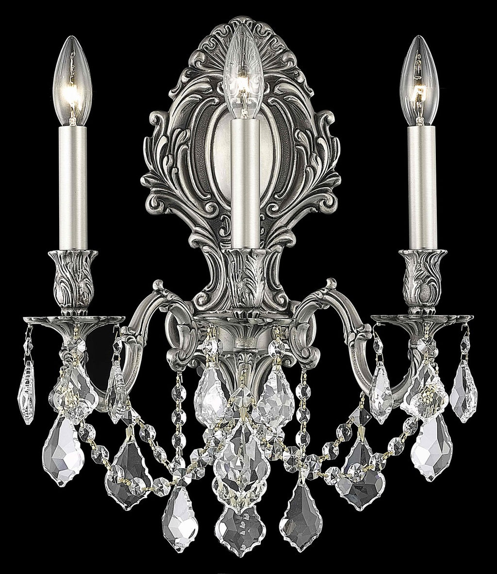 Regal and distinct, the Monarch collection of wall sconces flaunts a swirling vision of scrolls and crystal. A graceful oval backplate, accented with ornate curlicues, supports one, two, three, or five scrolled arms. The frame is finished in pewter, dark bronze, or French gold. Sculpted candle holders add to the dramatic effect, while the soft candelabra lights (bulbs not included) add the finishing touch to this spectacular design. A majestic addition to an entryway, office, or bathroom.