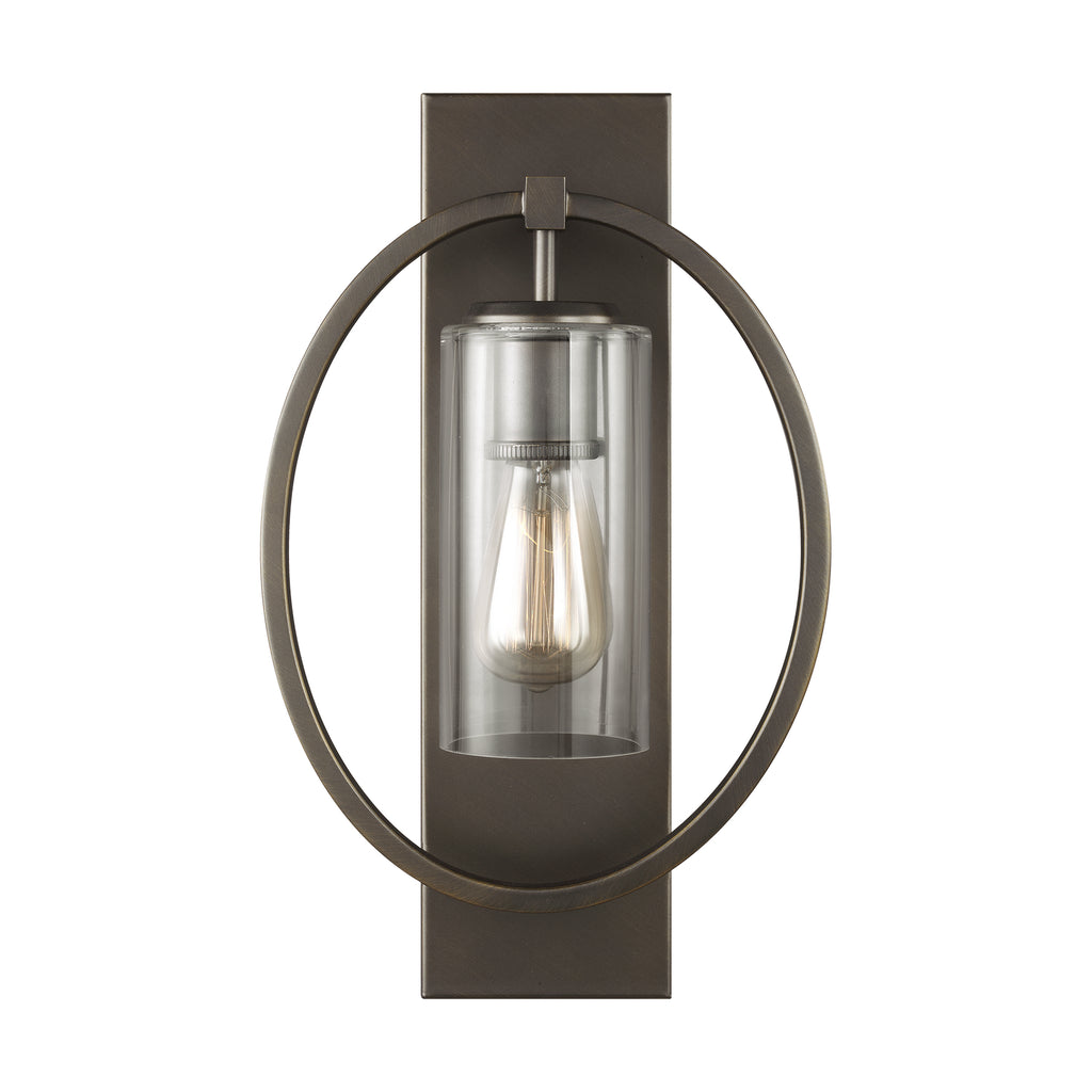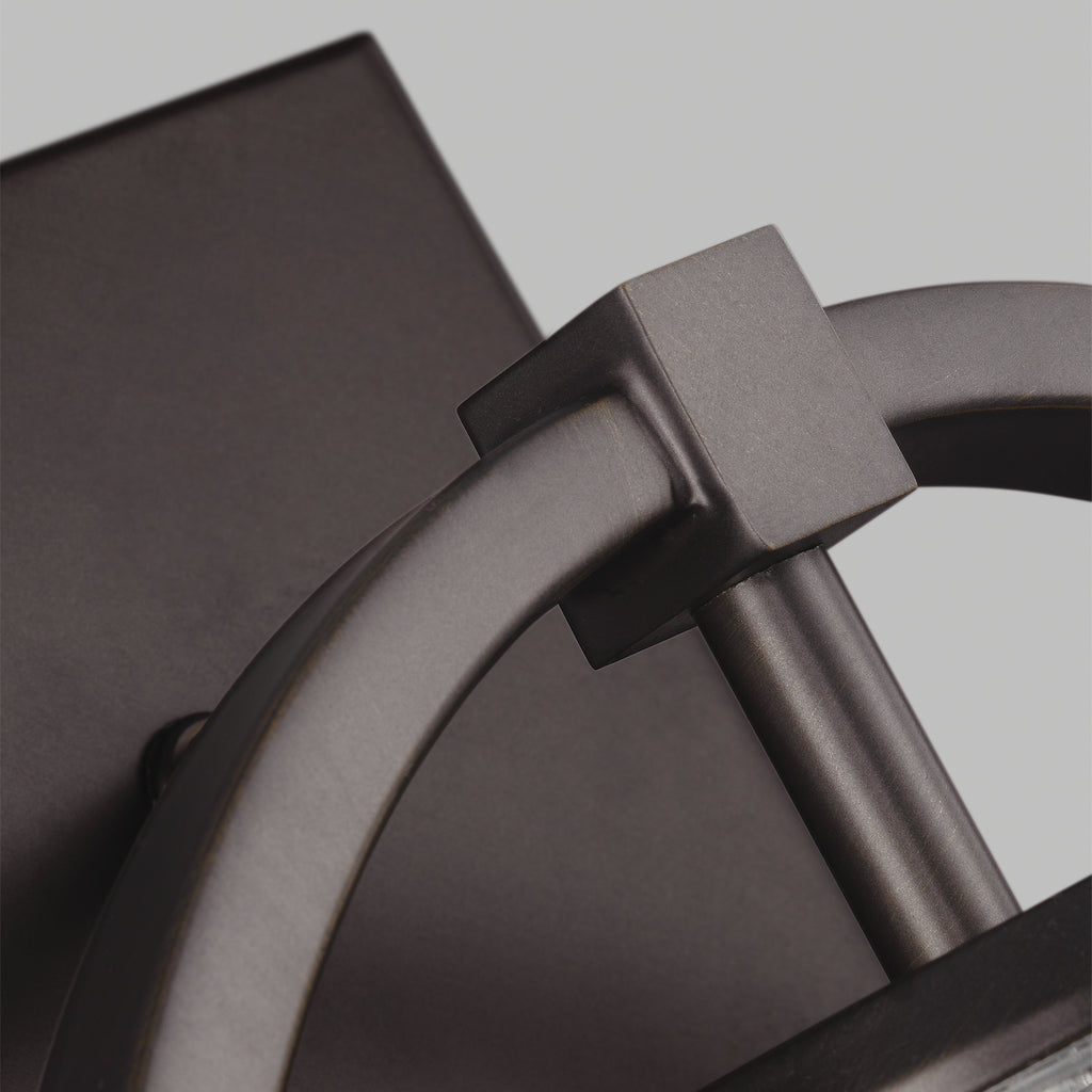 The geometric lines of the transitional Marlena Wall Sconce take inspiration from an oversized door knocker. A solid, mounted oval loop elegantly frames the cylindrical, Clear glass shade and highlights the lamp as a central element of the overall design. Marlena is more refined in Satin Nickel or Chrome, but our new Antique Bronze finish gives a warmer look and feel.