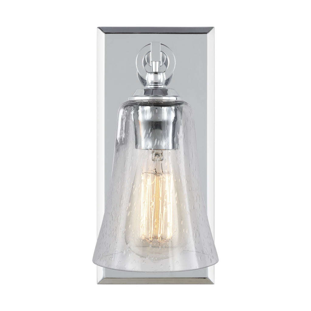 The Sean Lavin Monterro one light wall sconce in chrome provides abundant light for your bath vanity, while adding a layer of today's style to your interior design. Monterro features beautiful tapered glass shades and exquisite cast details, including a cast backplate, cast ring, and hook hardware that elegantly supports the shades. The Chrome version is available with two glass options, either White Opal Etched glass or Clear Seeded glass, while the Burnished Brass, Satin Nickel finish is available in Clear Seeded glass only.