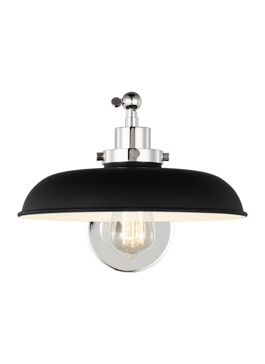 The Wellfleet one light wall sconce by Chapman & Myers is inspired by various classic utility silhouette's - from factory lighting to barn sconces - capped by contrasting metal hardware. Each shade of the Wellfleet collection is available multiple sizes of 3 versatile profiles, either a flat farm dome, a traditional factory dome, or tapered cone. The shades are available with either a black or white finish and are paired with either a burnished brass or polished nickel collar, chain and canopy.