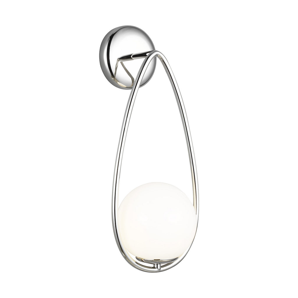 The Galassia one light wall sconce by AERIN in polished nickel perfectly balances a glass globe and curving teardrop frame, giving it a contemporary look. The white glass casts a soft, welcoming glow over a space. This piece works particularly well in a hallway.