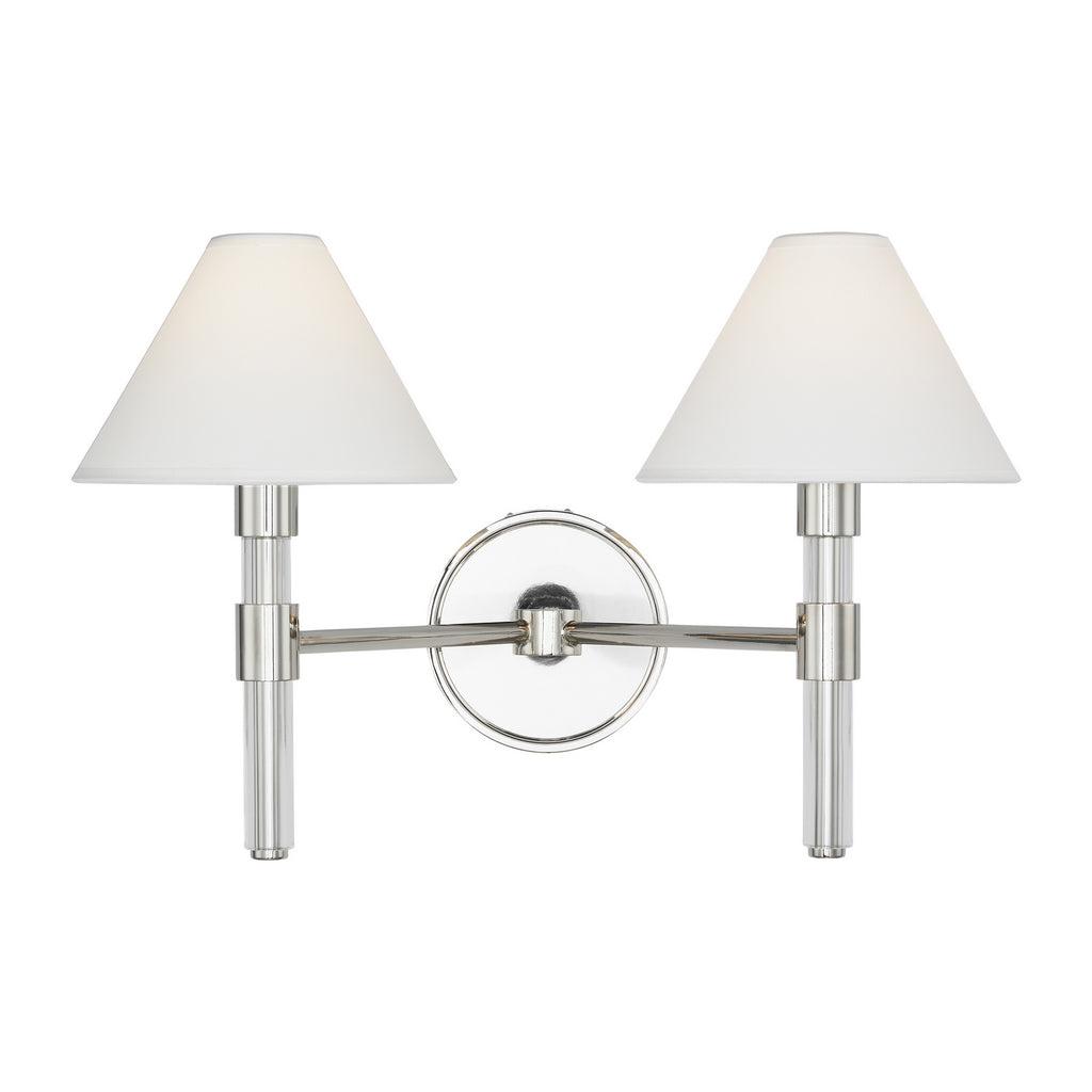 The Robert two light vanity fixture has strong clean lines of Lucite stems that elevate and support the paper empire shades in this shapely series.