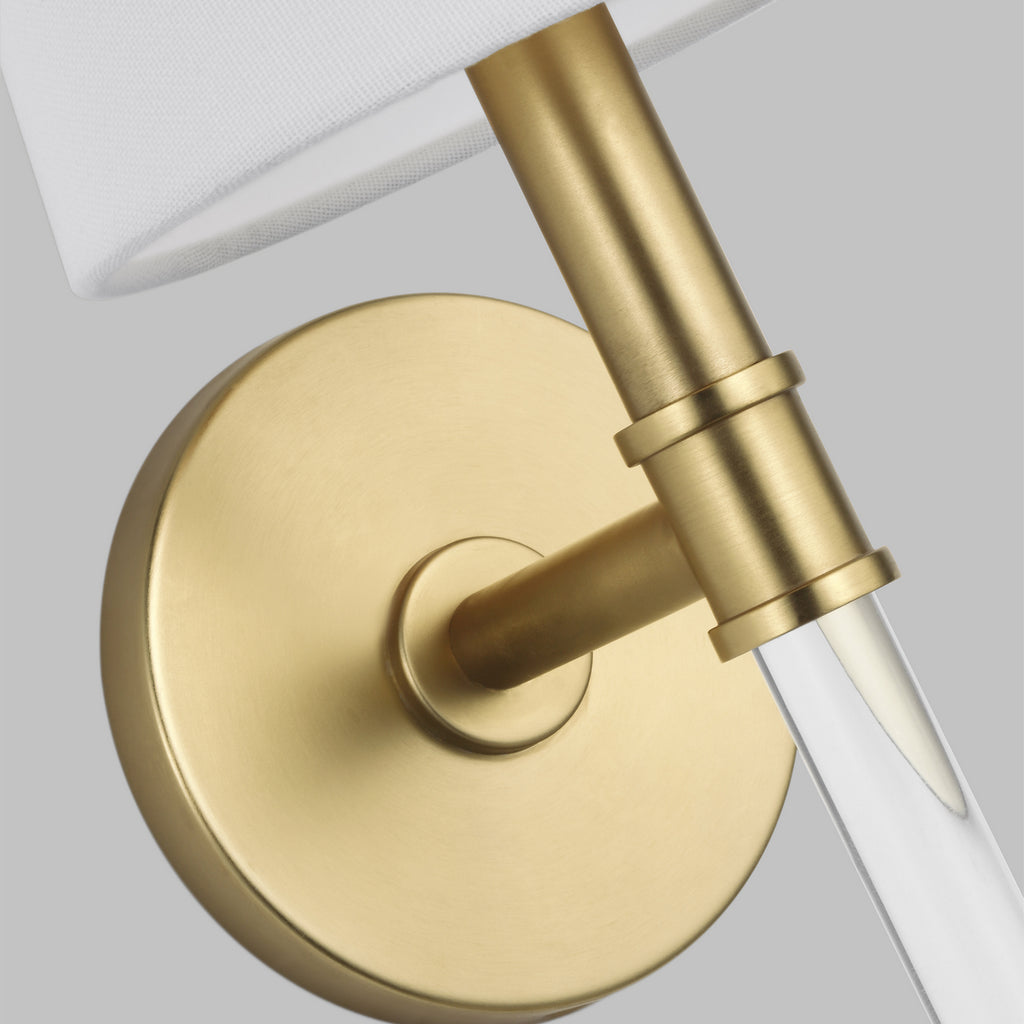 In the Hanover one light wall sconce, a Lucite arm forms an elegant, dynamic silhouette that stems from a hub of either Burnished Brass and Polished Nickel finish and extends to matching color candle tubes, topped with exposed candelabra bulbs. Round backplate.