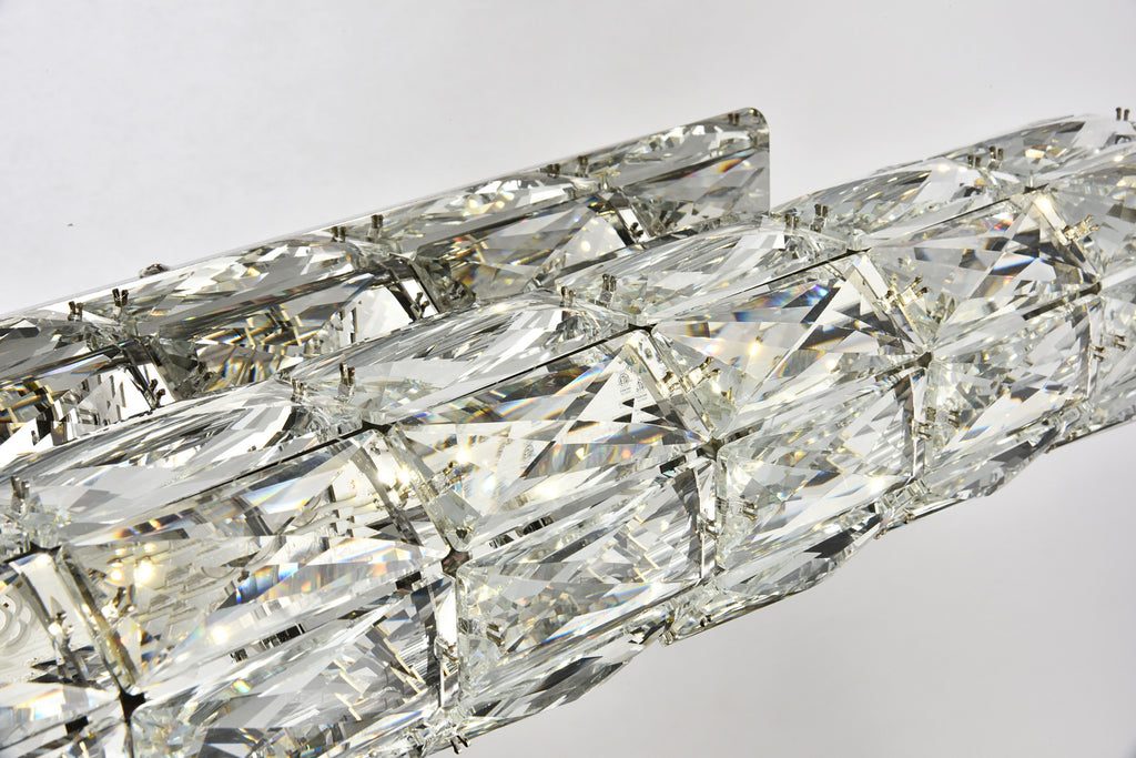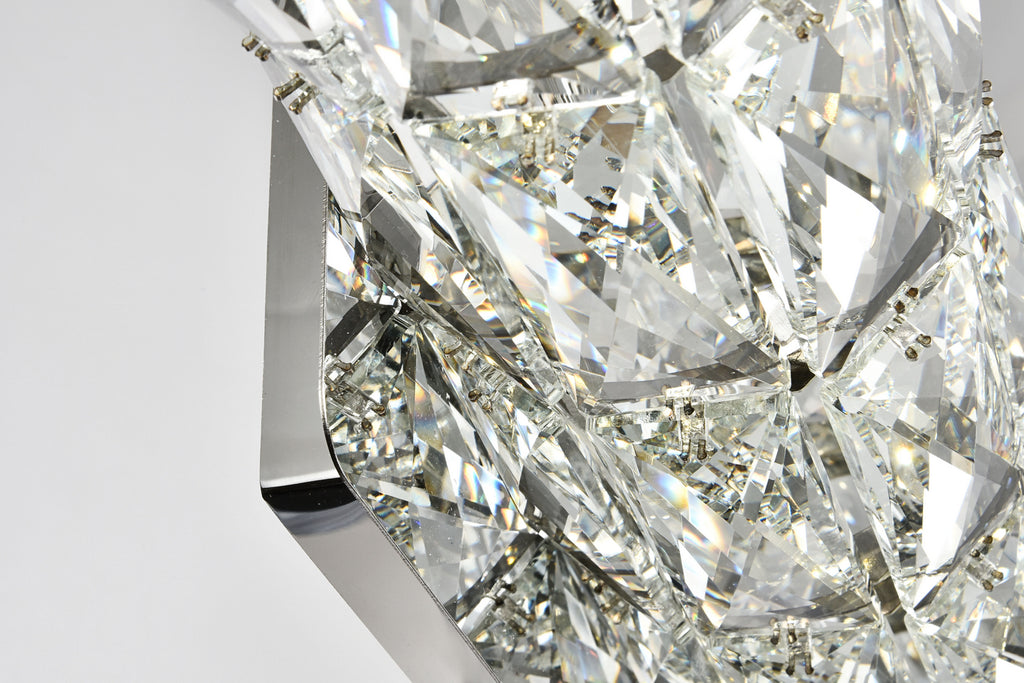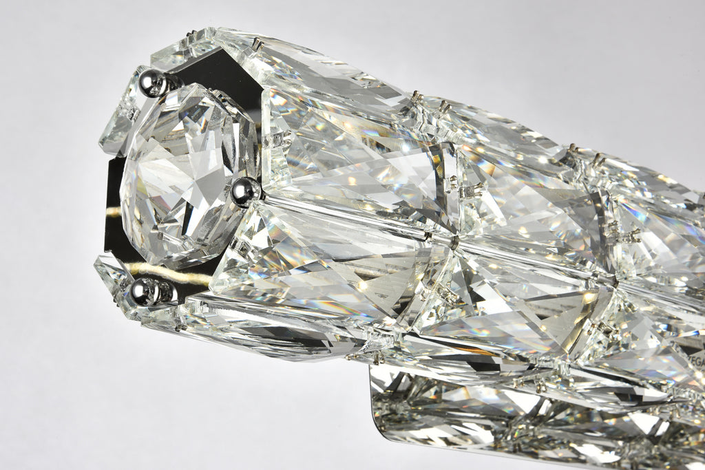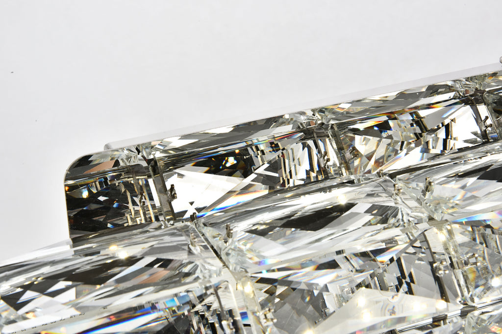 Valetta wall sconces dress up a bathroom, office, or bedroom without overwhelming the surrounding décor. This collection features an octagonal tube-shaped stainless-steel frame covered almost entirely with shining rectangular royal-cut clear crystals. Faceted crystal octagonal crystals cover both ends as a charming finishing touch. The chrome-finished backplate is polished to a mirror shine and reflects the glittering crystals for additional sparkle. A sleek chrome finish completes this modern look. Available in four size options.