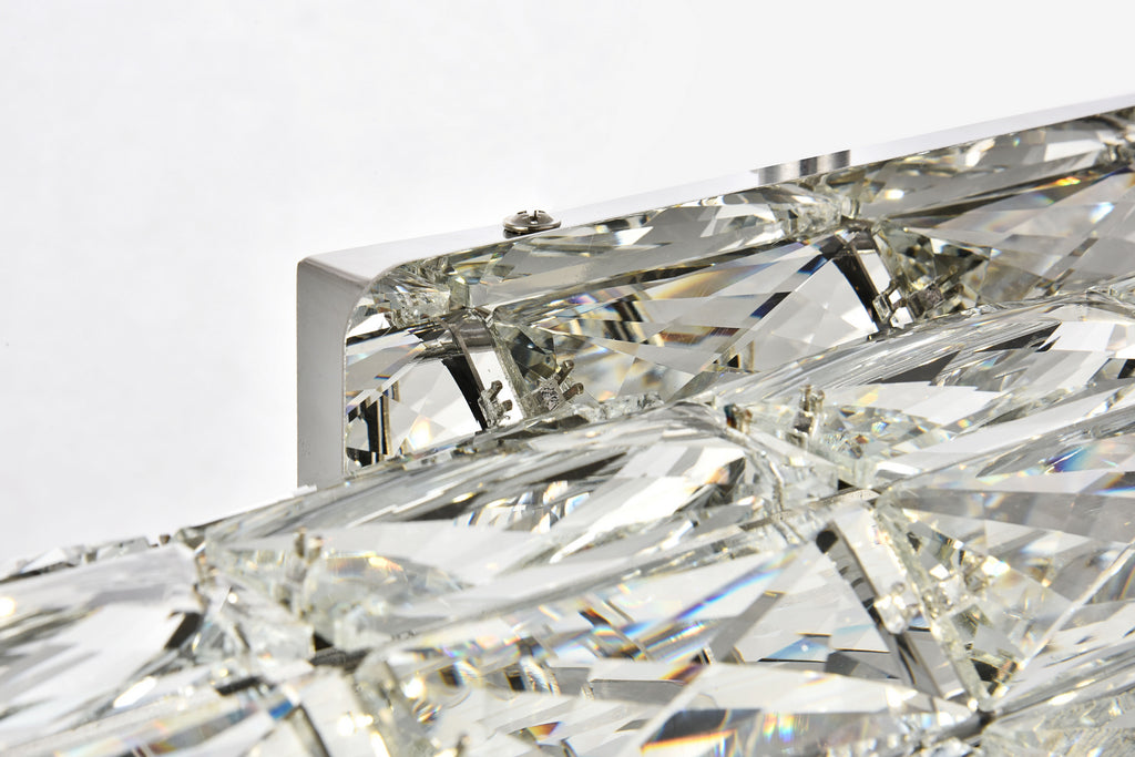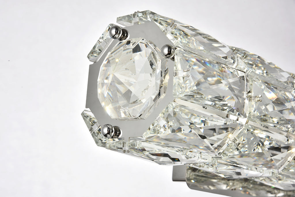 Valetta wall sconces dress up a bathroom, office, or bedroom without overwhelming the surrounding décor. This collection features an octagonal tube-shaped stainless-steel frame covered almost entirely with shining rectangular royal-cut clear crystals. Faceted crystal octagonal crystals cover both ends as a charming finishing touch. The chrome-finished backplate is polished to a mirror shine and reflects the glittering crystals for additional sparkle. A sleek chrome finish completes this modern look. Available in four size options.