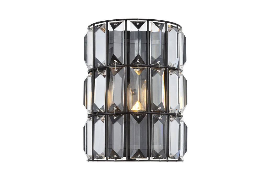 The Blair collection brings magnificent contemporary elegance to your hallway, study, or media room. This sconce is set in a cylindrical, Iron frame with an oil-rubbed bronze finish. The open, cage-like design forms three rows of rectangular spaces adorned with large, clear royal-cut baguette Crystals that gracefully refract light while drawing the eye to their organic beauty.