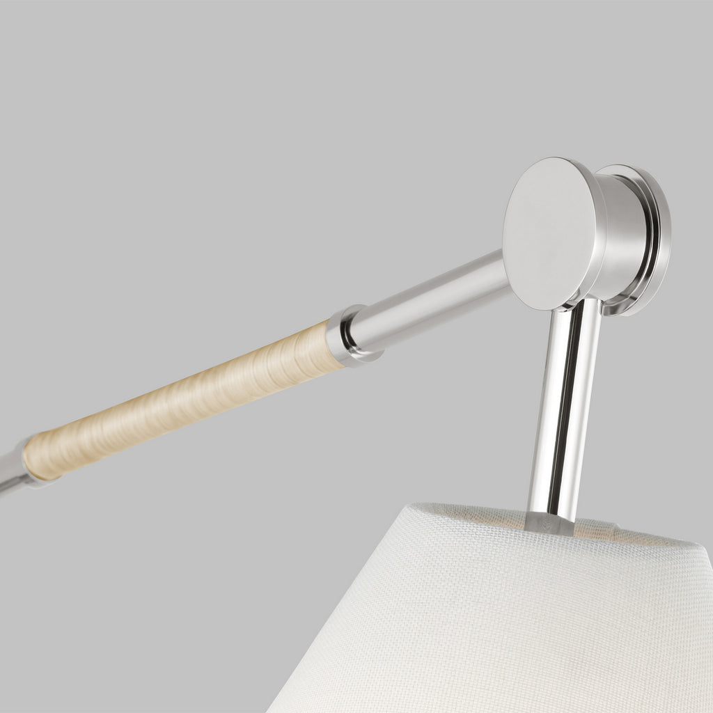 Inspired by the clean lines of minimalist design and the warmth of natural texture, alongside the practical appeal of Anglepoise lighting. The Remy sconce by AERIN for Visual Comfort Studio has a movable linen shade and an adjustable stand to focus soft illumination where it's needed most. A contemporary light created with clean lines, the addition of a rattan-wrapped section adds natural warmth and a distinctive look.