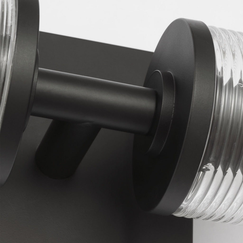 Modern aesthetic meets textural detail in the Sarita sconce by Drew & Jonathan. Ribbed glass completes the streamlined cylindrical forms while diffusing light and elegantly contrasting the bold square backplate. This sophisticated sconce will lend a subtle industrial accent and is ideal for bathrooms.