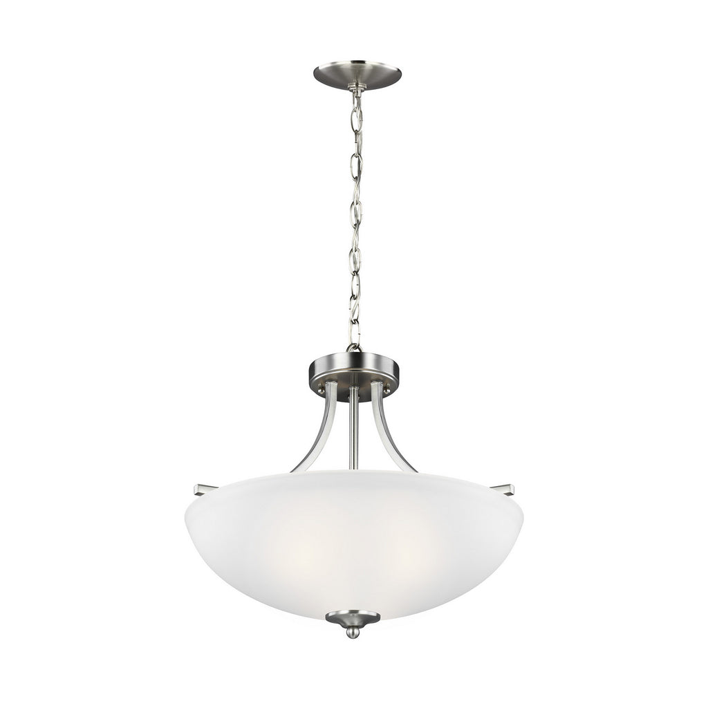 The Geary three light indoor semi-flush convertible in brushed nickel provides abundant light to your home, while adding style and interest. Adaptability takes center stage with the Geary Collection. This series of traditional up-light pendants, semi-flush and flush-mount fixtures feature decoratively bowed arms and constructed of rectangular steel tubing. Geary is a true cross-collection piece, offered in four beautiful finishes Blacksmith, Brushed Nickel, Burnt Sienna and Heirloom Bronze. The Geary has a universal appeal matching 24 different interior collections. Offering subtle style with practical design, Geary is at home in almost any room. The fixtures have a fluid movement with a traditional look to complement a wide range of decor.