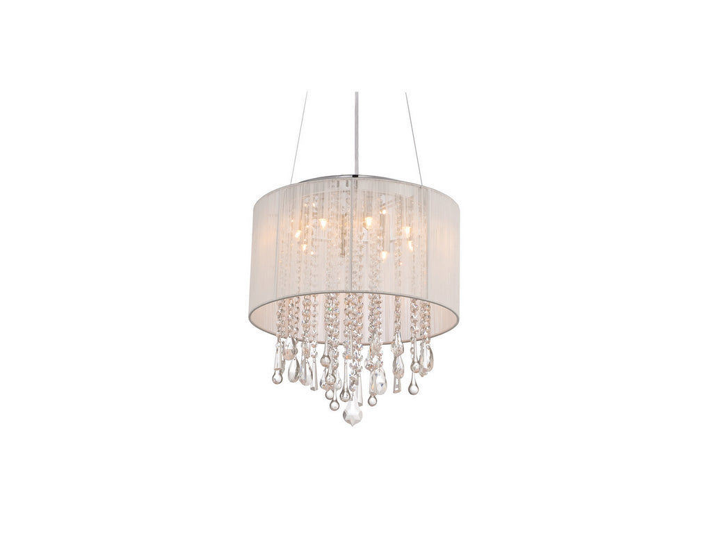 Bring a dramatic focal point to any area of your home with the unique round Beverly Dr. collection convertible ceiling mount's stunning style. Cut and polished crystals are held in place with stainless-steel rings and illuminated by brilliant halogen points of light and graced by a beautiful silk string shade.