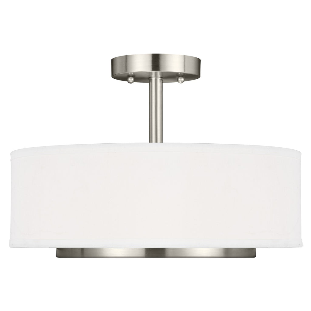 The Nance two light indoor semi-flush convertible in brushed nickel provides abundant light to your home, while adding style and interest. The mid-century inspired Nance lighting collection by is a versatile transitional design which fits in a wide array of traditional or contemporary settings. The tapered, off-white, faux silk shades add warmth and sophistication. The large pendant and semi-flush faux silk drum shades are complemented nicely with Satin Etched Opal glass diffusers to soften the downlight. In either of the available Brushed Nickel or Heirloom Bronze finishes, all the Nance fixtures are timeless additions to any foyer, kitchen or dining area. The assortment includes three- five- and nine-light chandeliers, a one-light wall sconce, two- and three-light bath vanities and a two-light semi-flush convertible drum pendant. Incandescent and ENERGY STAR-qualified LED lamping are available, all fixtures are California Title 24 compliant.