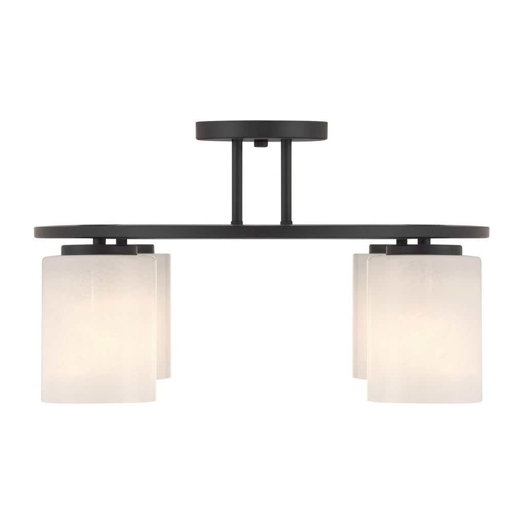 Illuminate any room with the bold modern style of the Savoy House Herron 4-light ceiling semi-flush mount. Its sleek, round structure wears a Matte Black finish and is decorated with cylinders of swirling, stunning strie glass. Herron is 12" in height and 24" in width. It uses four standard size bulbs of up to 60 watts per bulb. Bulbs not included.