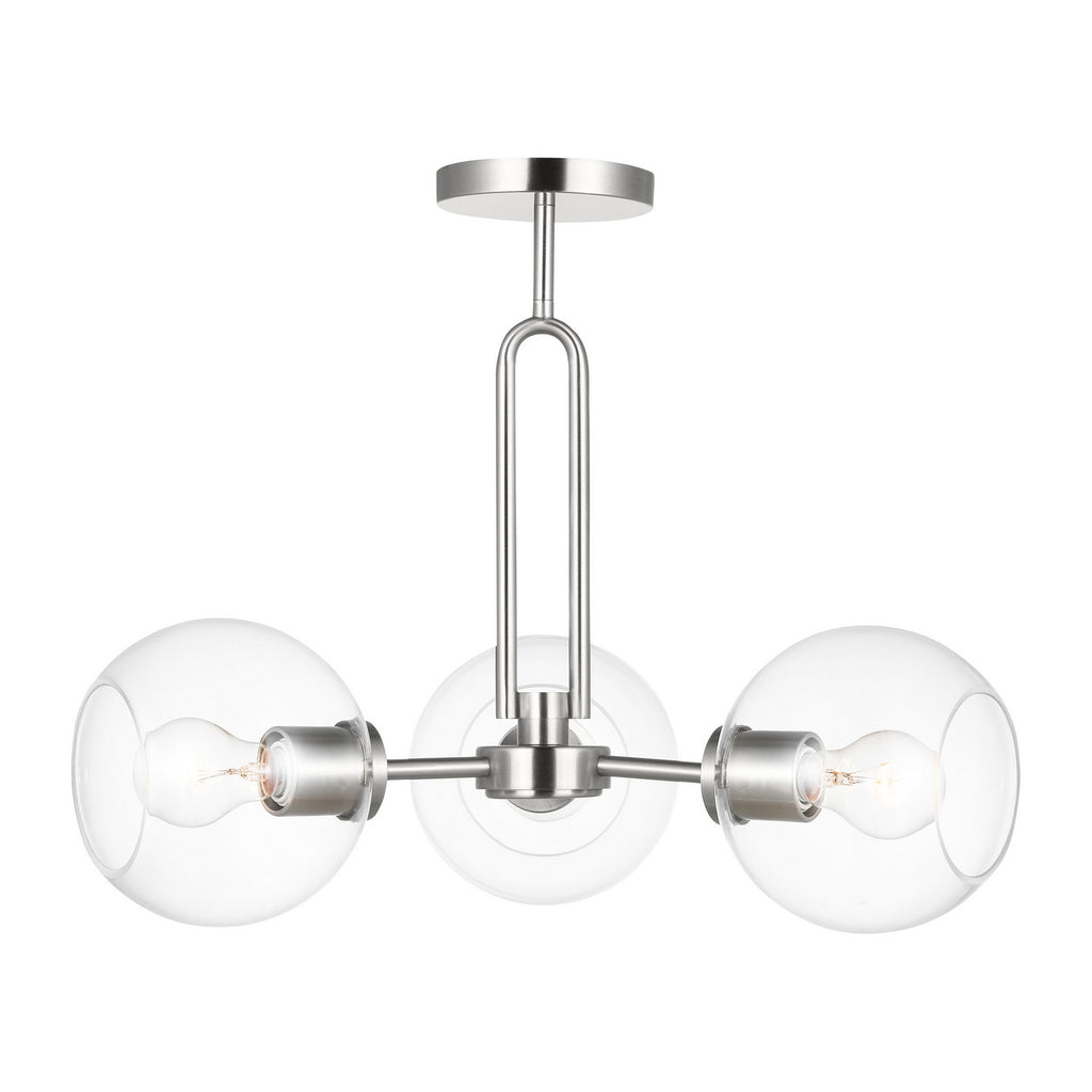 The Codyn three light semi flush fixture in brushed nickel silver is a contemporary take on a classic mid-century design. Clear glass shades with open-ended spheres accent the elongated keyhole strap detail, for a clean look. This minimalist collection relies on subtle details to create visual interest