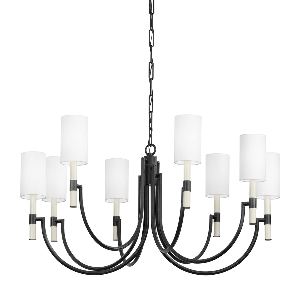 Graceful downward sweeping arms straighten and extend into square metal accent tubes that hold cream-colored candle sleeves, creating an elegant look that is effortlessly useable. Both finishes add texture, with the Vintage Gold Leaf bringing warmth and the Forged Iron a more dramatic feel. The sconce and the chandelier are each available in two sizes and both finishes to fit any interior space.