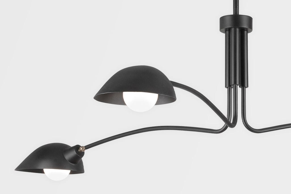 Minimalism with presence, Leo has a clean, sculptured look that fills a space. Rounded shades suspend from sprawling metal arms, all in a soft black finish. The three-bulb chandelier is over six-and-a-half feet in diameter and the six-bulb chandelier is seven feet in diameter. The shades rotate to create a customized lighting plan. This expansive fixture will bring stunning style to any large space.