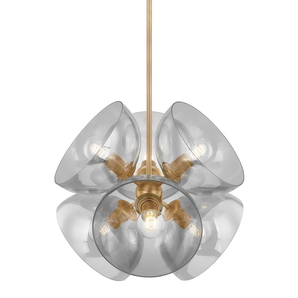 Salix puts an organic spin on a mid-century modern Sputnik silhouette. This voluminous pendant features a compact array of glass bowls that form a stunning outward-facing bloom of light. The allover smoke glass finish of the shades is complemented by warm Patina Brass metalwork.