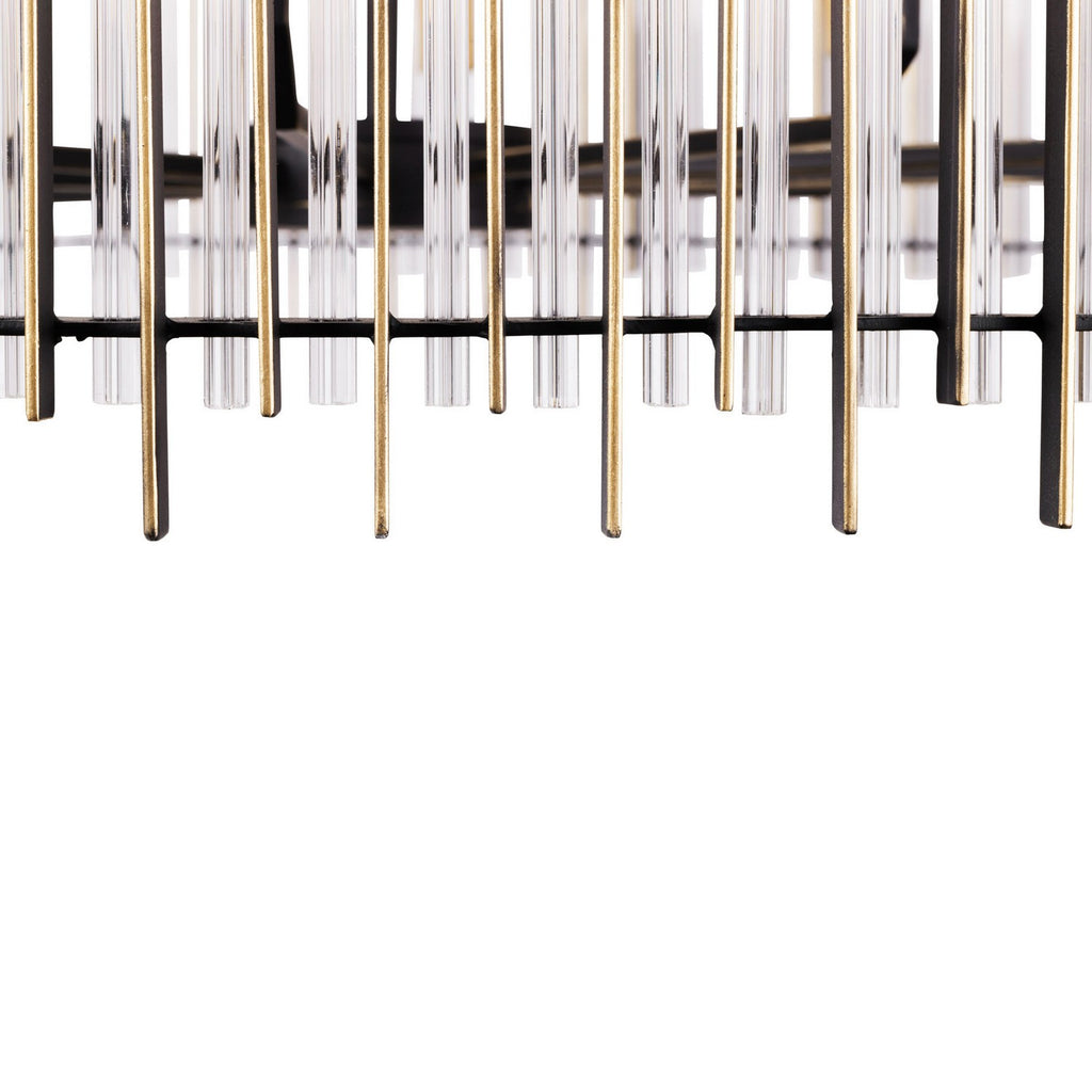 Inspired by the elements of New York City's Brooklyn Bridge as depicted in an illustration found in Smithsonian American Art Museum, the Park Row collection is sure to bridge the gap between functionality and inspired design. The Brooklyn Bridge's neo-Gothic stone towers support a hybrid cable-stayed/suspension bridge design, with both vertical and diagonal suspender cables, which are the inspiration for Park Row. The interwoven cables create a repeating pattern that we have wrapped around and support modern clear fluted, recycled glass rods. The collection is hand-forged from 70% recycled steel. Hand-finished in matte black with French Gold edges.