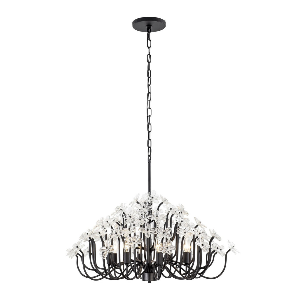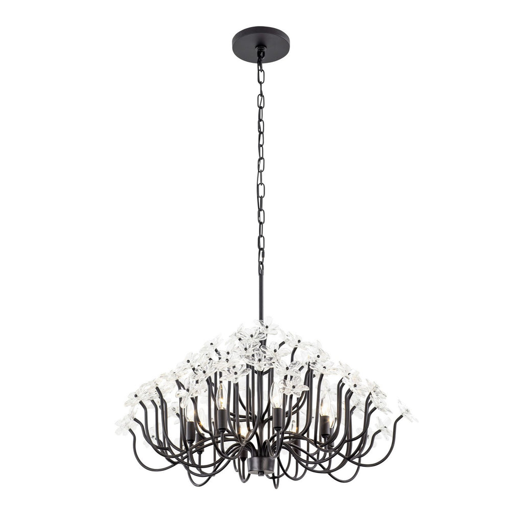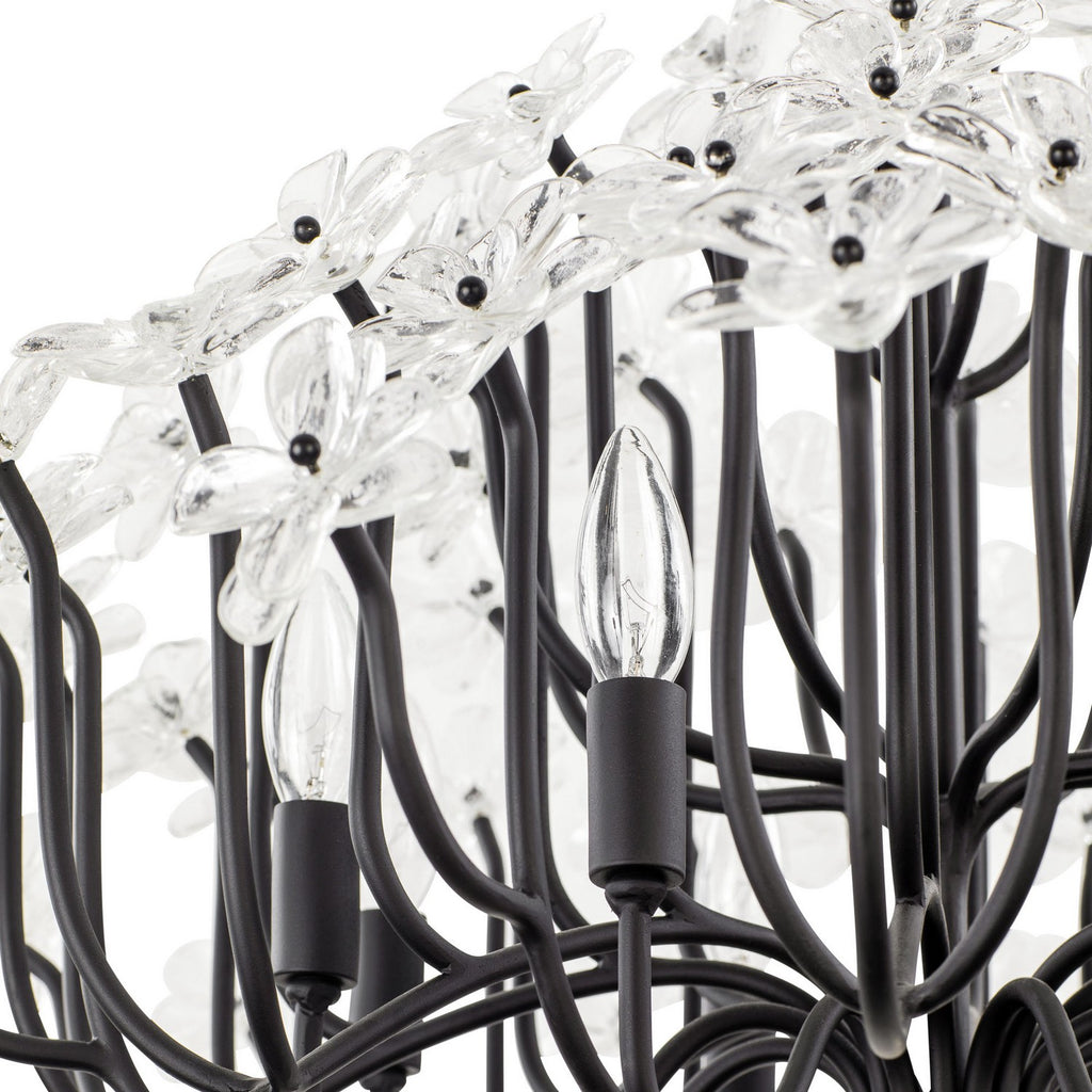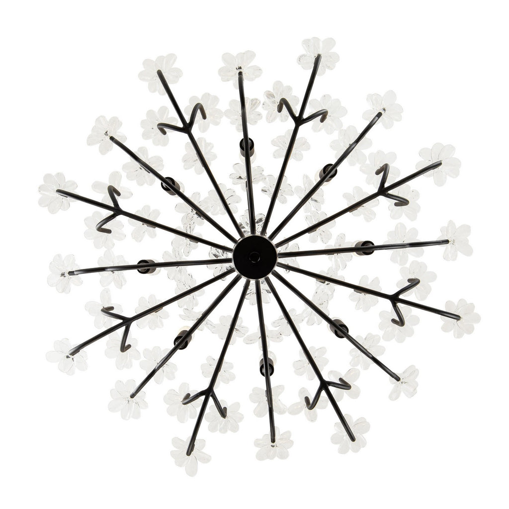 When you first see it aglow with its fine intricacies, it may not show, but the Wildflower collection started its path to existence thanks to Mary V. Walcott's Oconee-Bells discovered in the Smithsonian Libraries and Archives Special Collections. Taking center stage is a touch of Danish modern on top of midcentury. Wildflower combines delicate, handmade ice glass flower petals, with equally delicate wispy hand-forged and recycled steel tubing and metal work. Available in gold or black.