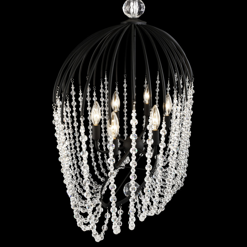 Parasol frames meet their crystal crush in this new pendant collection. Umbrella frames, carnival rides and birdcages clearly present in the design. But Continuing the frame lines with crystal is an unusal twist. Glam, coastal and cottage all coalesce together into one pretty, shimmery and airy pendant.