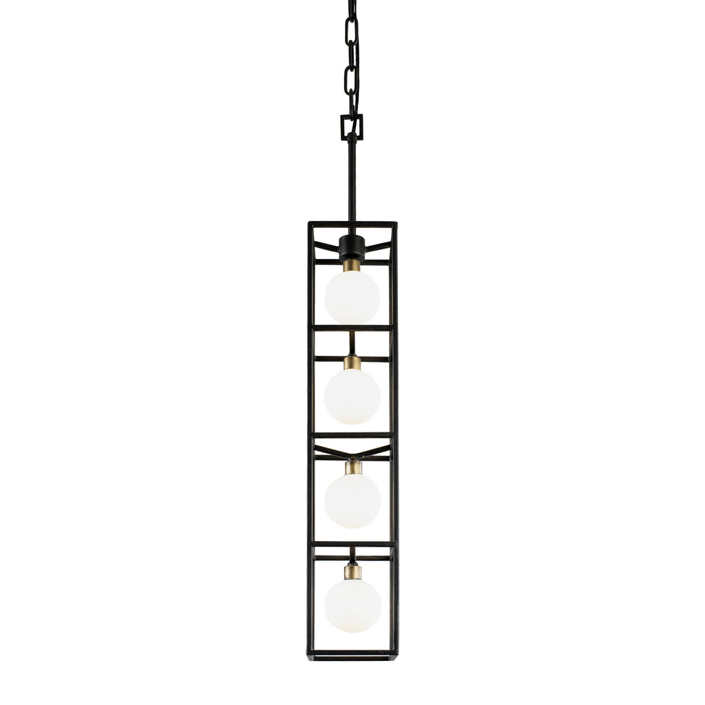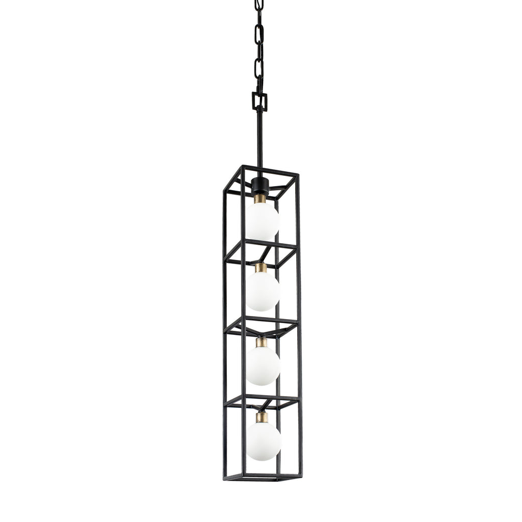 Plaza is the ultimate post-modern marvel. Inspiration comes from a nod to 1970's grand hotel and public space fixtures. Its gorgeous recycled matte opal glass globes are perfectly balanced on hand-forged geometric bars.