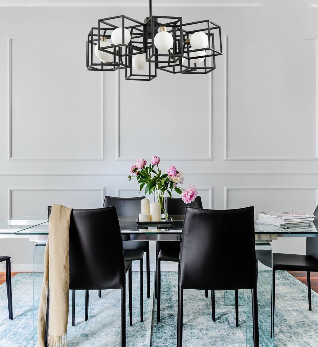 Plaza is the ultimate post-modern marvel. Inspiration comes from a nod to 1970's grand hotel and public space fixtures. Its gorgeous recycled matte opal glass globes are perfectly balanced on hand-forged geometric bars.