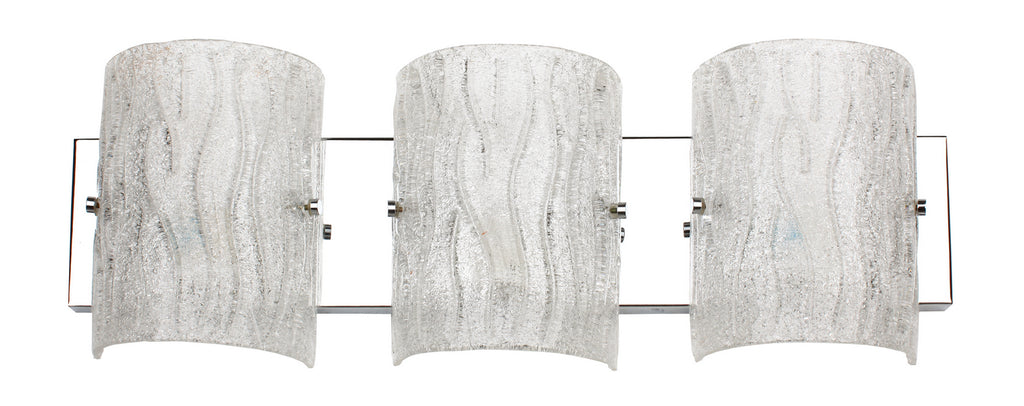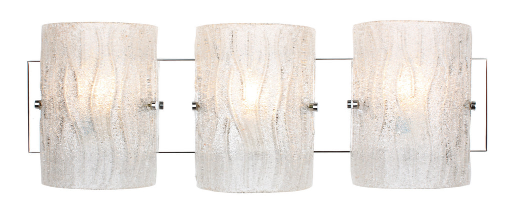 It's back! This popular design from Varaluz's past makes a modern and bright return. Named appropriately for its overall lighting effect, these fixtures marry crystally-cool ice glass, handmade Murano style with clear glass chips fused by heat on the back side, to clean and simple chromed metal work.