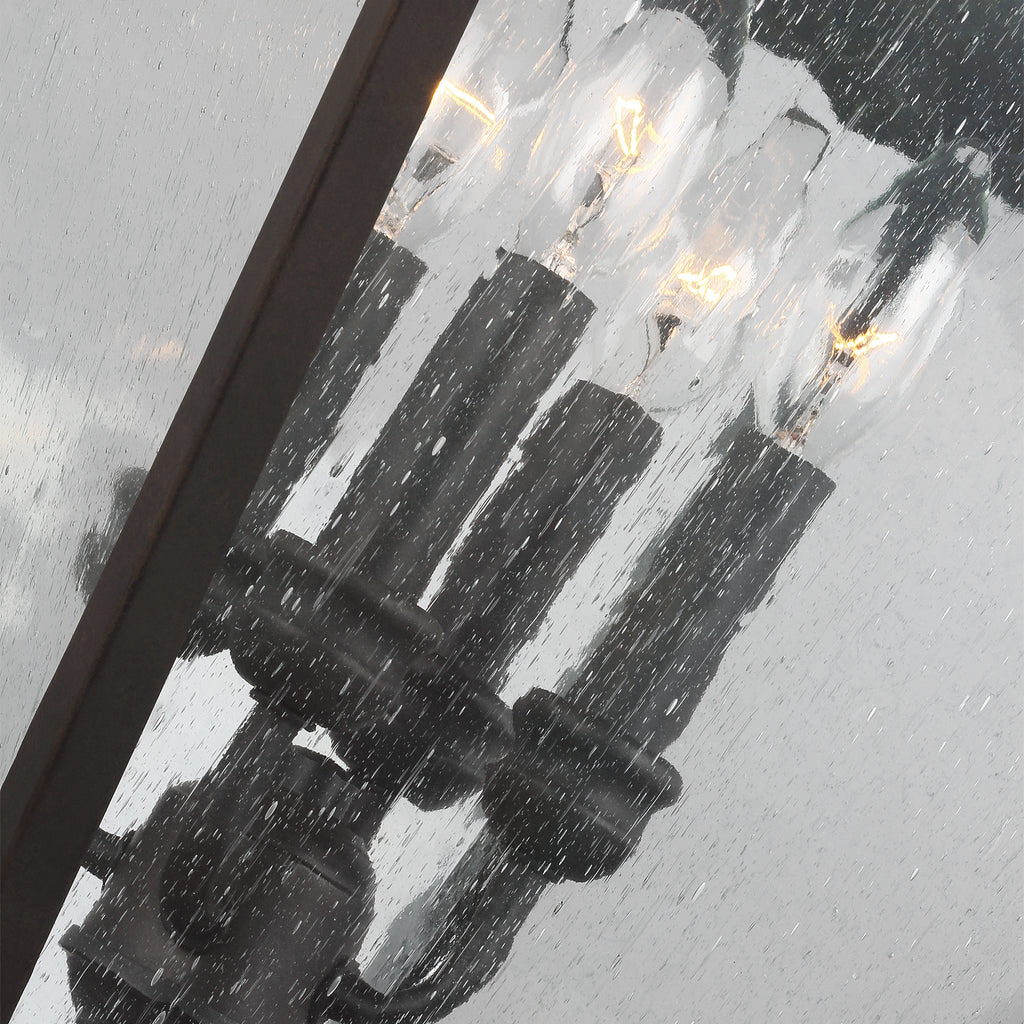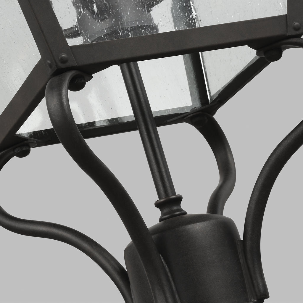 The Sean Lavin Galena four light outdoor post top in sable creates a warm and inviting welcome presentation for your home's exterior. Galena is a Europe-inspired classic lantern. Simple and refined, Galena features a gently curved hook detail atop a vented, square-off roofline, and candle tubes floating within the tapered Clear Seeded glass shades. Galena is a warm, welcoming silhouette offered in our NEW Sable finish.