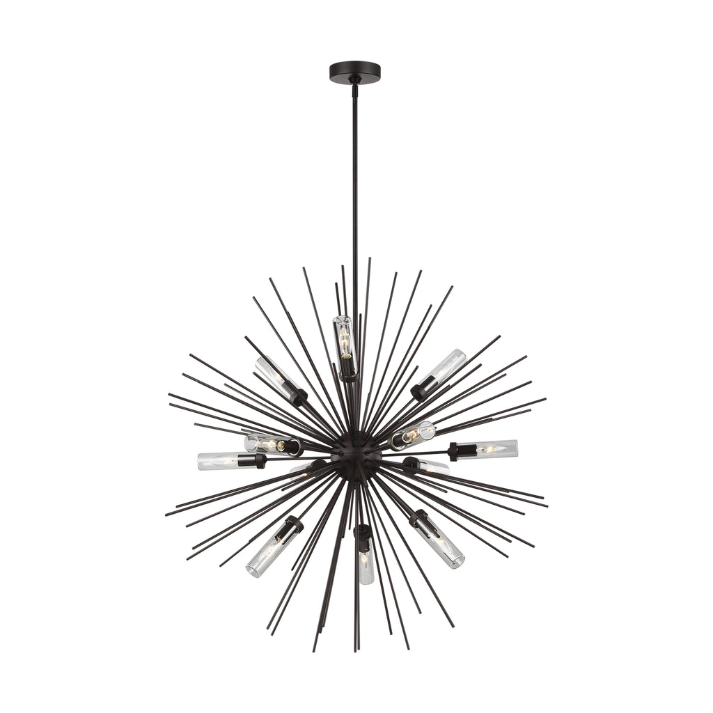 The Hilo, twelve outdoor light chandeliers in oil-rubbed bronze, enhances the beauty of your property, makes your home safer and more secure, and increases the number of pleasurable hours you spend outdoors. Hilo features slim metal arms extending from a center hub to create an organic globe silhouette. This damp-rated fixture is perfect for modernizing both indoor and covered outdoor spaces. Hilo uses candelabra bulbs covered in clear glass to protect from moisture.