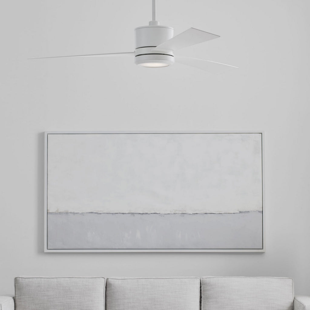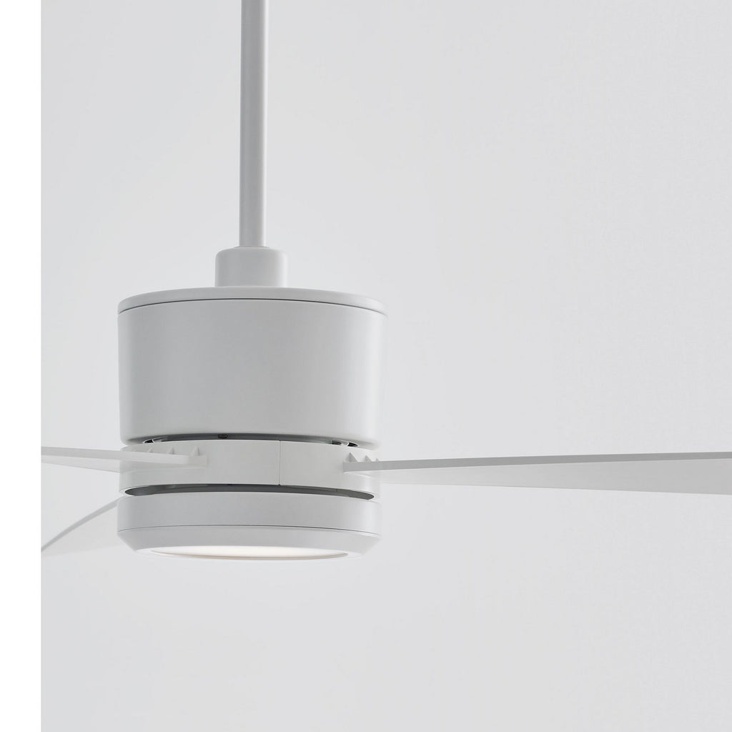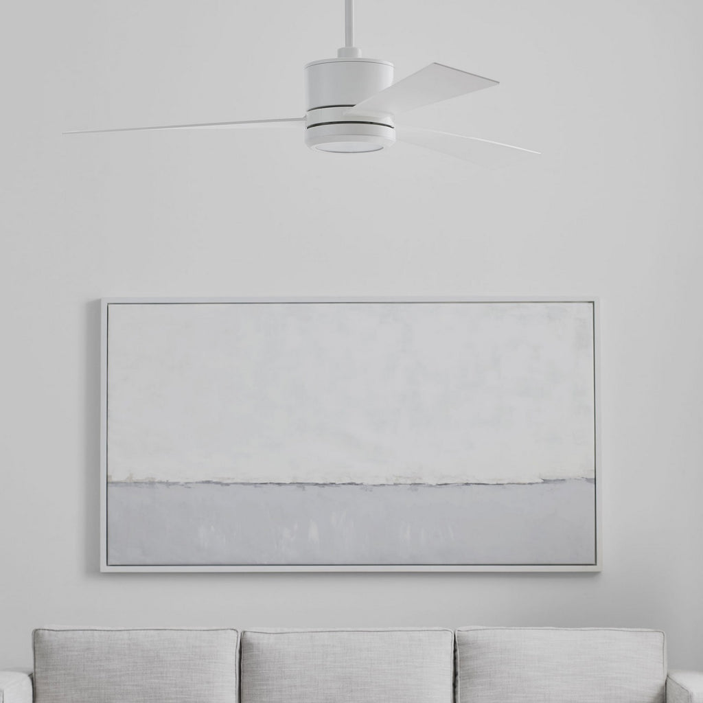 The Sean Lavin Vision 52 in Matte White features a 153.0 X 18.0 3-speed motor with a Twelve-degree blade pitch. The Vision 52 ceiling fans are sleek and modern and come in four unique finish combinations to create the right look for its surrounding decor. A two-in-one remote (combo hand-held and wall mount) offers reverse, downlight, and dimming control.