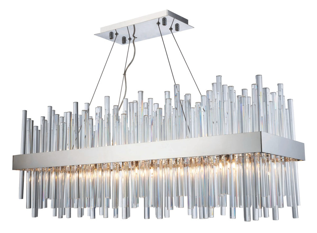 This stately fixture combines timeless elegance with modern and attractive sophistication. The delicate juxtaposition of upright and hanging clear glass rods creates a truly stunning visual statement, seamlessly woven together within a sleek chrome frame. This expressive piece would be a welcomed and treasured addition to a wide range of contemporary residential styles.