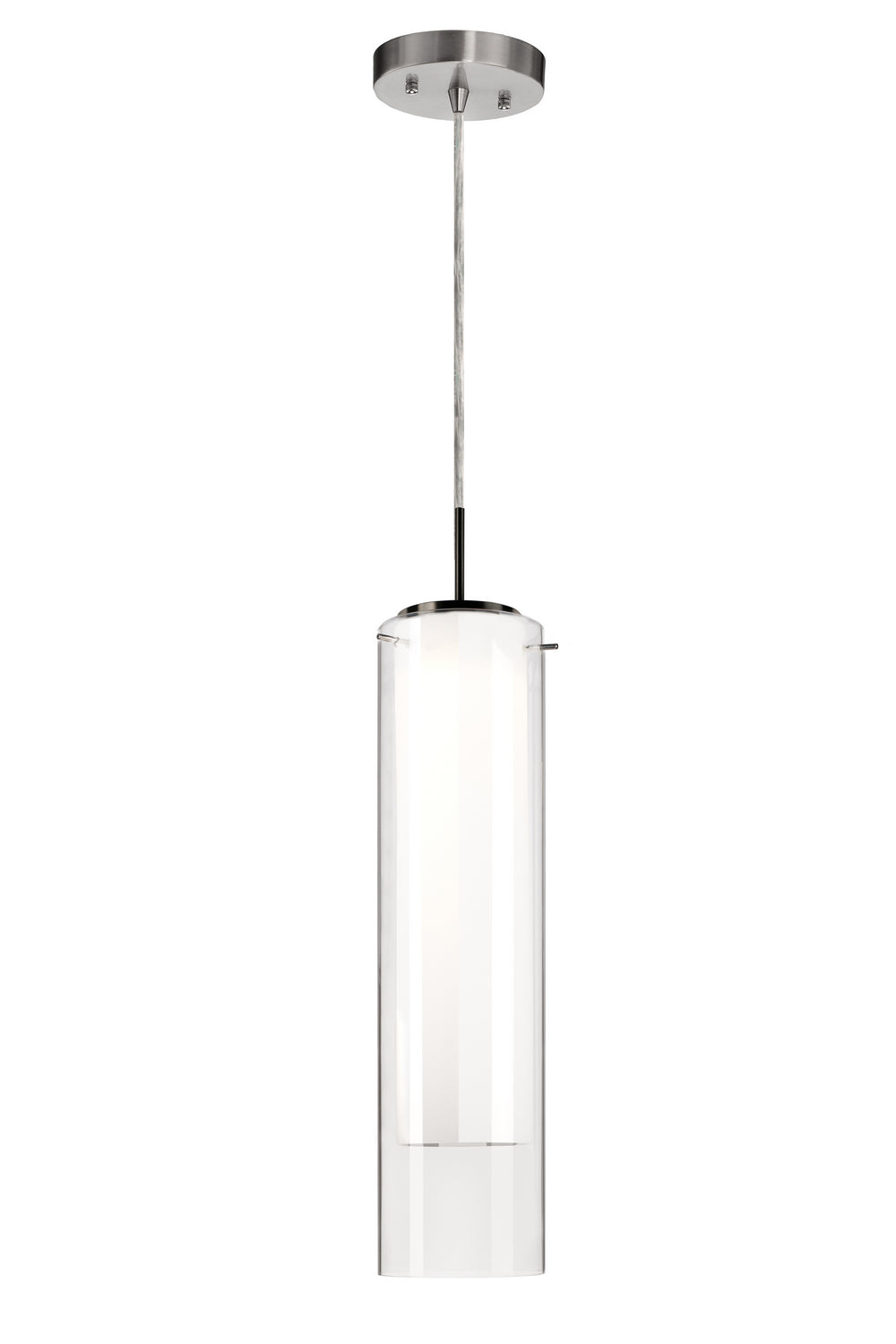 Single LED pendant fixture with cylindrical glass shade plus concentric cylindrical diffuse white inner shade. Minimal clear glass styling plus brush-Nickel finish makes Verona suitable for a host of interior applications. The inner shade removes all glare from the LED source and makes Verona ideal for lighting small dining tables - or use in multiples over larger countertops. Verona uses Kuzco SSL braided cable. Available in two sizes, please view series for more details.
