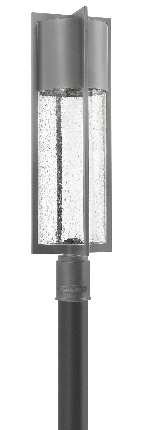 Shelter's minimalist style in aluminum creates a chic, dramatic statement as the light from above grazes through its clear seedy glass. Shelter comes standard Dark Sky compliant.