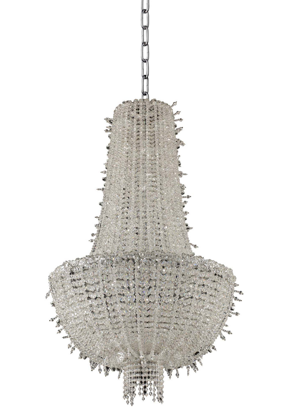 A modern take on a classic empire shaped chandelier. Our version features multi layers of delicately draped crystals for a full and dimensional brilliant ice like glow. Works in a modern, classic or shabby chic environment. Designed with your lifestyle in mind.