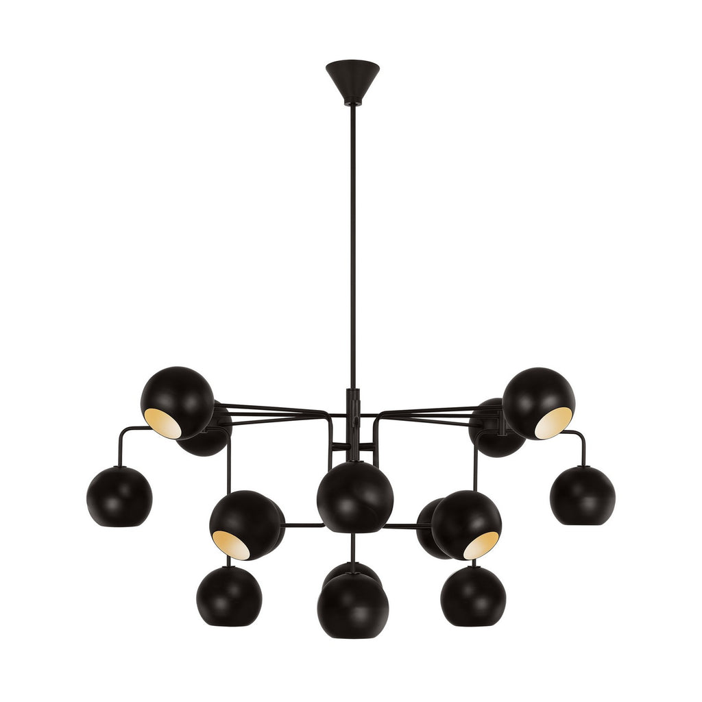 Designed by Christiane Lemieux, the Chaumont sixteen light multi tier chandelier in aged iron provides abundant light to your home, while adding style and interest. Inspired by the mobiles of Calder and classic French mid-century forms, the multi-directional shades suggest movement. This series includes 3 large chandeliers and a task sconce, all available in a dramatic Aged Iron living finish which will patina over time.