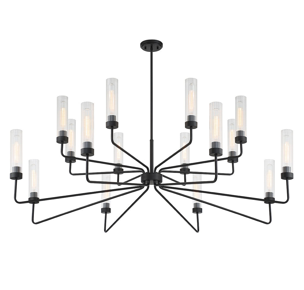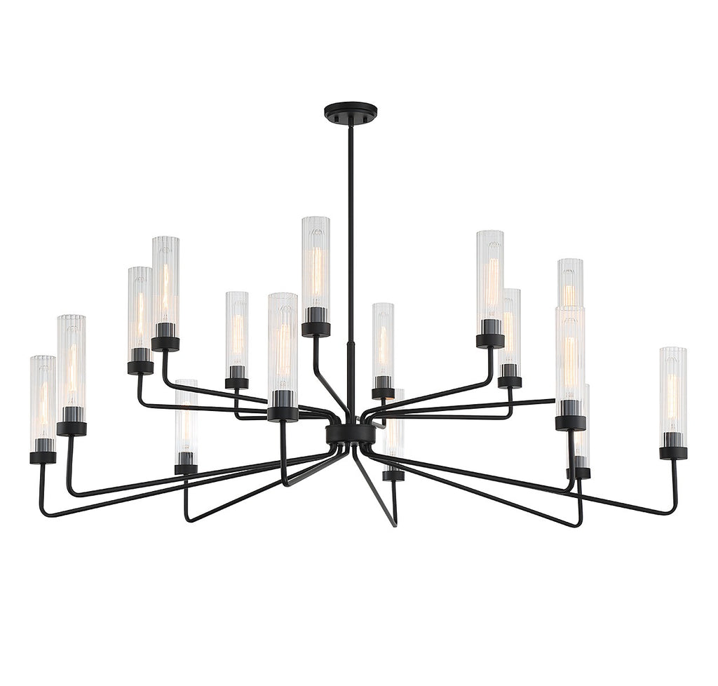 The expansive Savoy House Baker 16-light chandelier is the perfect way to brighten up a large room with lots of crisp, clean style. Two tiers of slender arms, each topped with a slim clear ribbed glass shade, radiate out from the center and are finished in matte black. Baker is 61" in width and has an adjustable height ranging from 29" to 77". It uses 16 standard size bulbs of up to 60 watts per bulb (bulbs not included). Comes with four 12" downrods and one 6" downrod.