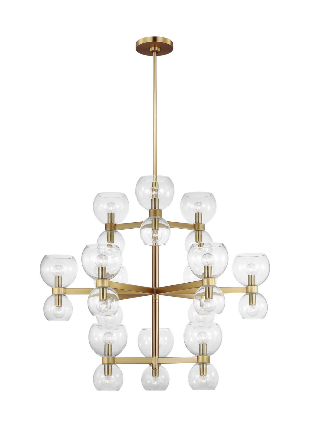 Londyn is inspired by geometric playful midcentury fixtures in metal and glass with exciting profiles and scale play. Rectangle stock metal rods and a playful layout of blown glass globes in two sizes with elegant metal cuffs create visual interest. This chandelier would be great above a dining table or casual island/nook.