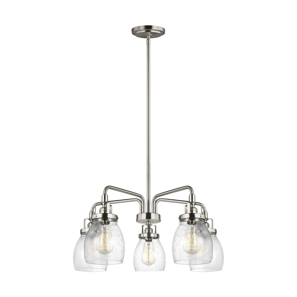 The Belton five light single tier chandelier in brushed nickel is an ENERGY STAR qualified lighting fixture that uses LED bulbs to save you both time and money. Influenced by the vintage industrial designs of early 20th Century America, the transitional Belton lighting collection has seeded glass shades and Midnight Black finish, adding a layer of retro design to the warm look.