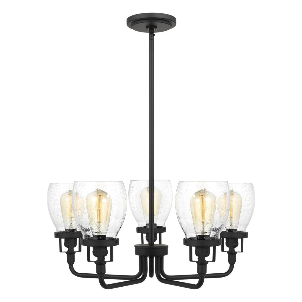 The Belton five light single tier chandelier in midnight black enhances the beauty of your home with ample light and style to match today's trends. Influenced by the vintage industrial designs of early 20th Century America, the transitional Belton lighting collection has seeded glass shades and Midnight Black finish, adding a layer of retro design to the warm look.