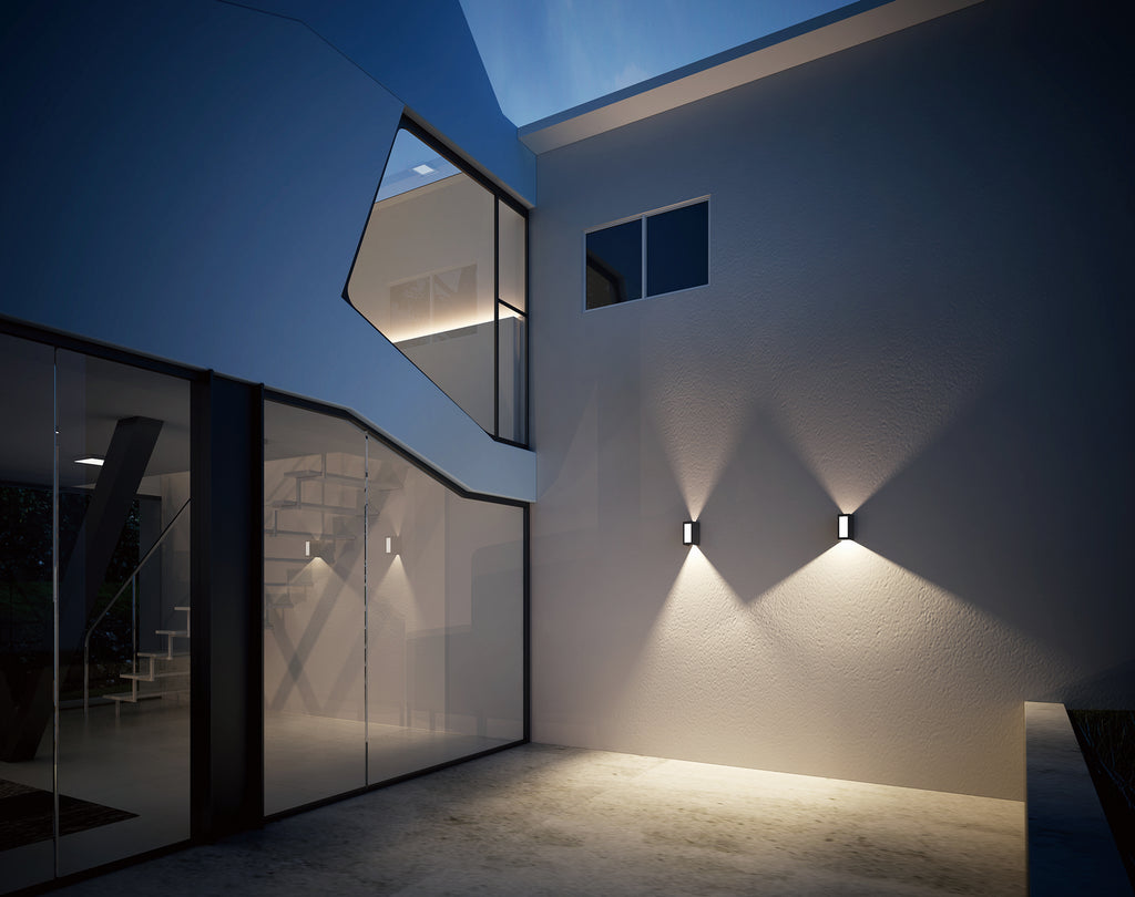 Architectural exterior wall sconce, die-cast rectangular aluminum body with two adjustable kickers to change beam angle above and below the fixture. Frosted PC diffuser at front acts as indicator with an even, hot-spot free indicator. Please Note: for single gang switch box install only, not intended for Octagon Junction Box. Canopy and back plate for Octagon Junction Box installation sold separately.