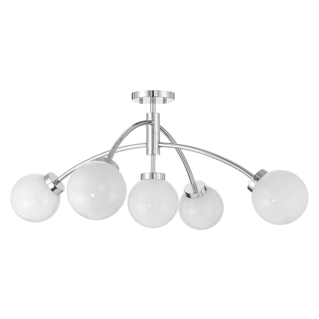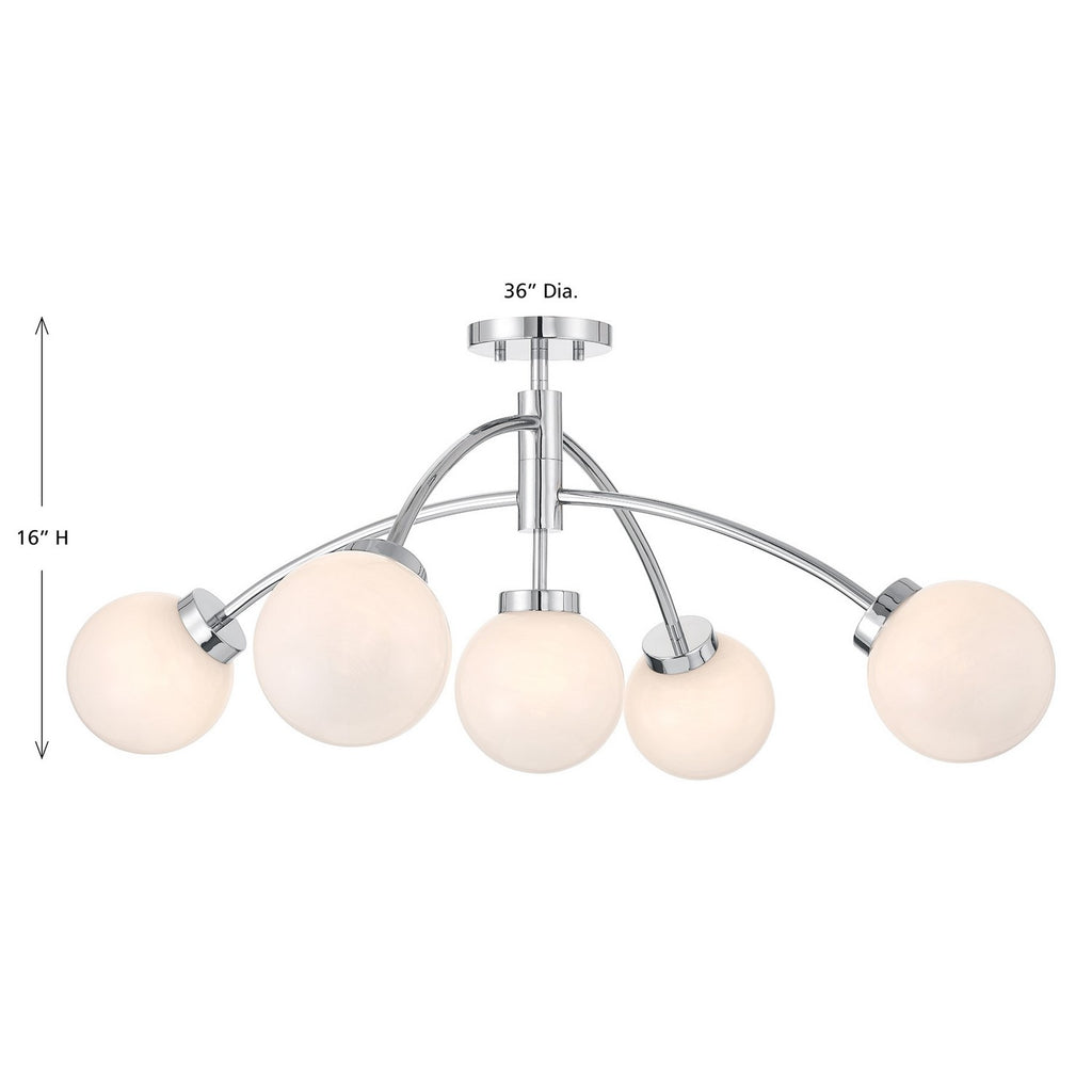 Bring in the big, bright and bold Savoy House Redfield 5-light semi-flush mount! Dazzling with mid-century modern inspiration, its curving arms hold orbs of swirling, stunning white strie glass that pairs beautifully with the Chrome finish. Redfield is 16" in height and 36" in width, making it an excellent choice for illuminating large rooms. It uses five G9 LED bulbs of up to 3.5 watts per bulb. Bulbs not included.
