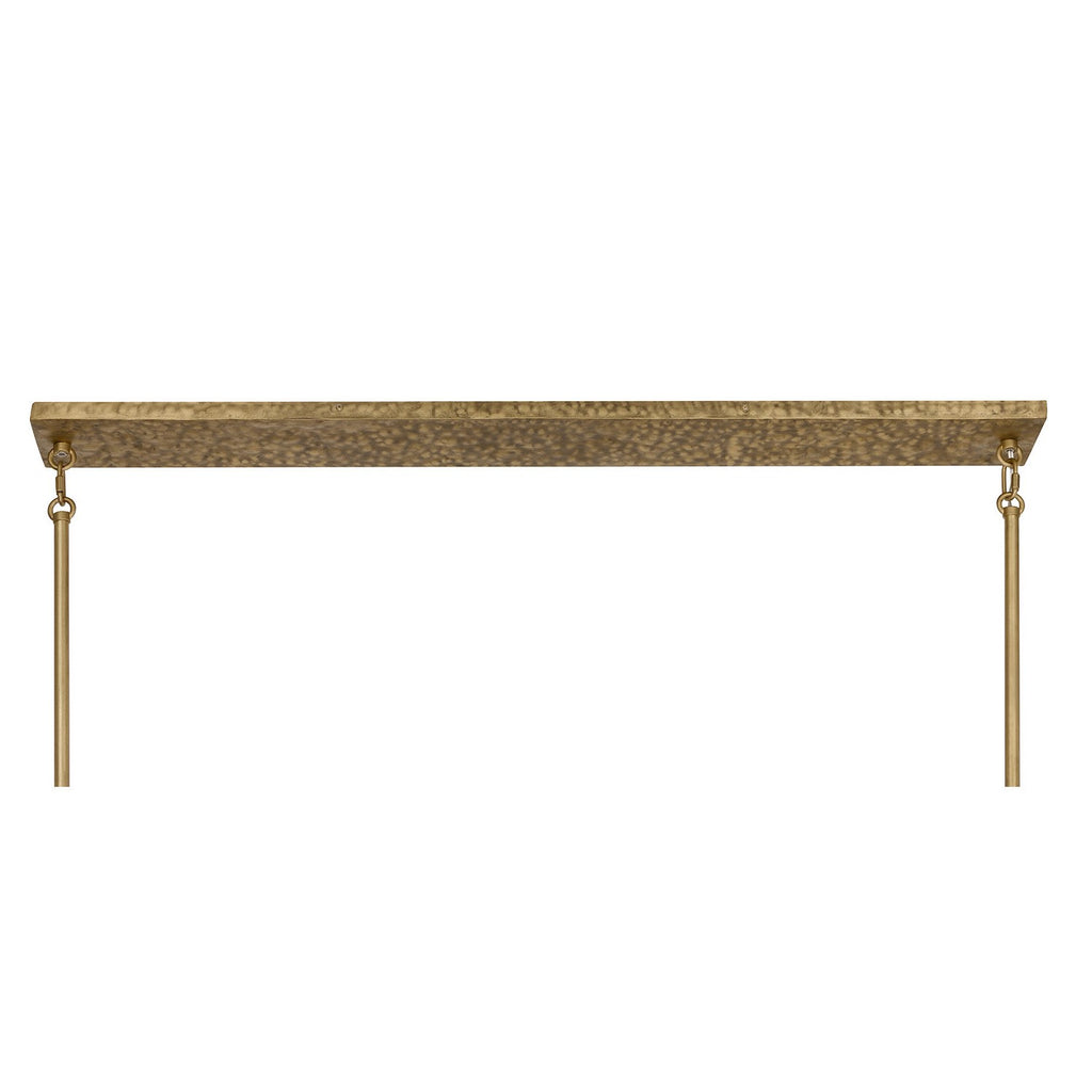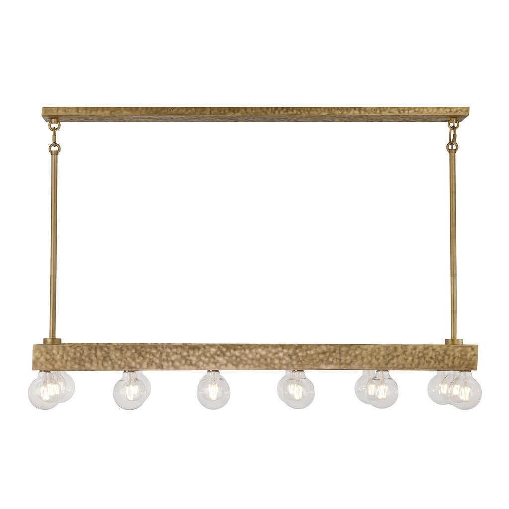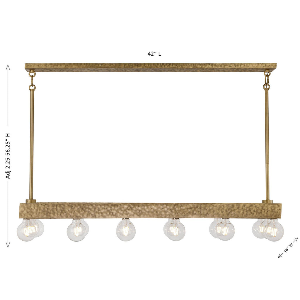 The Savoy House Etereo 14-light linear chandelier was designed by award-winning interior designer and TV host Breegan Jane. Etereo means ethereal in Spanish and this gorgeous style is a perfect example of the word. There is a hint of Old Hollywood glamour in this design, bringing to mind the vanity mirrors in the dressing rooms of iconic movie stars. The highly textured hammered metal frame is finished by hand in Spumante, a gorgeous gold tone that accentuates the mottled detailing. Etereo is 42" in length, 16" in width and has an adjustable height ranging from 2.25" to 56.25". It uses fourteen standard size bulbs of up to 60 watts per bulb. Bulbs not included. Comes with eight 12" downrods and two 6" downrods.