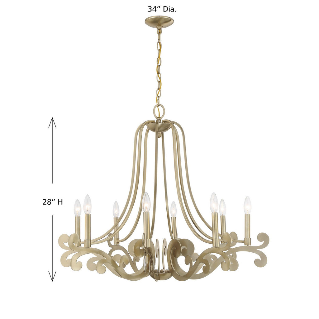 The Savoy House Lombard 8-light chandelier has a delicate, ethereal look with curling, twirling flourishes and a Noble Brass finish. It is a perfect way to add elegant illumination to any room! Lombard is 28" in height and 34" in width. Uses eight candelabra size bulbs of up to 60 watts per bulb. Bulbs not included. Comes with 120" of chain.