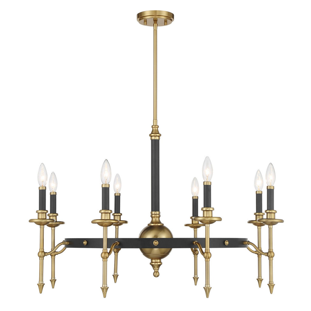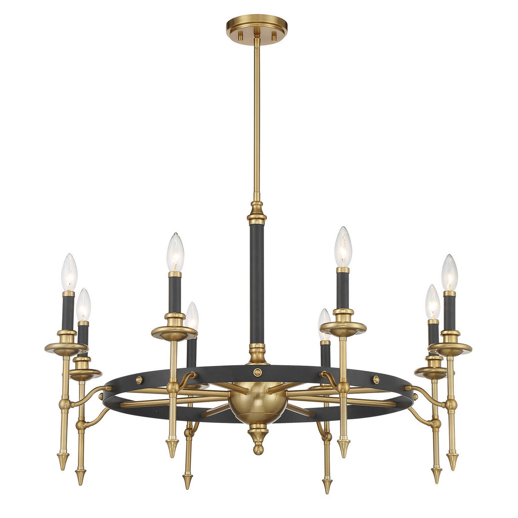 The Savoy House Consulate 8-light chandelier offers up stately and traditional style with a bold new twist thanks to the two-tone Warm Brass and Black finish. Use it to add a regal touch to any room! Consulate is 34" in width and has an adjustable height ranging from 22" to 76". It uses eight candelabra size bulbs of up to 60 watts per bulb. Bulbs not included. Comes with four 12" downrods and one 6" downrod.