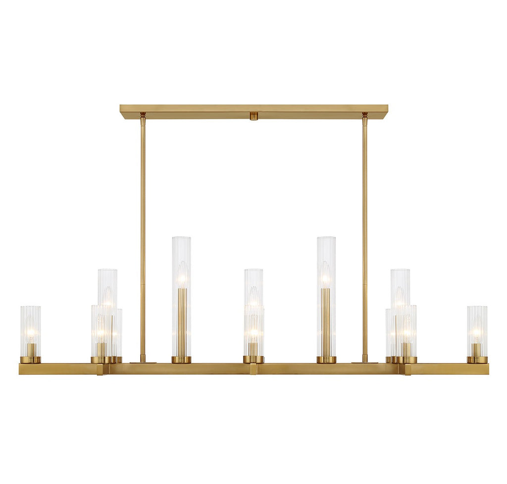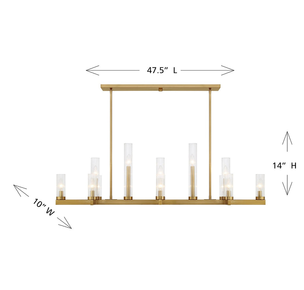 This effortlessly elegant Savoy House Carina 13-light linear chandelier features a beautiful Warm Brass finish and lights standing at different heights, creating a pleasing pattern that is sure to draw attention. Each light is encased in a clear ribbed glass shade to add texture. Carina is 47.5" in length, 10" in width and has an adjustable height ranging from 14" to 56". Comes with eight 12" downrods and two 6" downrods. Uses thirteen candelabra size bulbs of up to 60 watts per bulb. Bulbs not included.