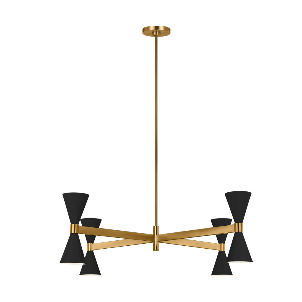 The Albertine chandelier by AERIN for Visual Comfort Studio Collection emits ample light above and below from eight conical lights on a crossed frame. This sophisticated piece provides a strong focal point in a large room and is a versatile style that works in both traditional and contemporary interiors. Ideal for a living room or above a dining table.