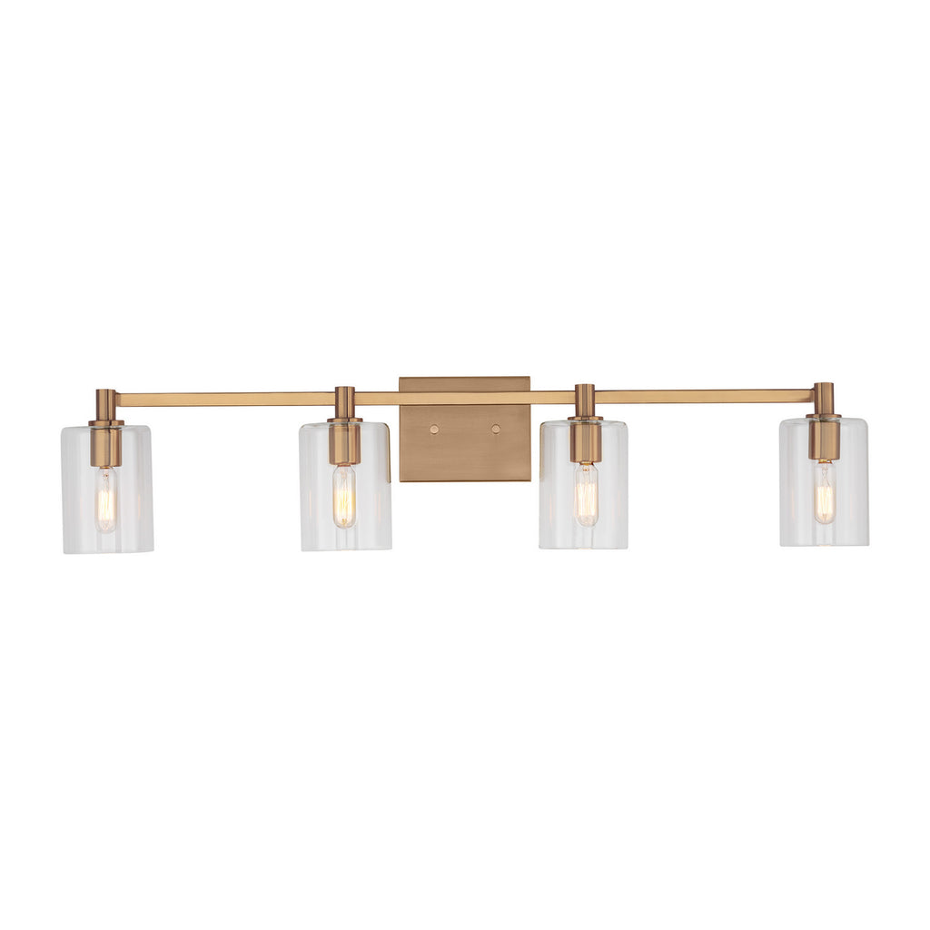 The Fullton four light vanity fixture in Satin Brass is sleek, contemporary, and uber minimalistic. Visual interest is created using a mix of rectangular and round frames, a subtle design detail. Although this collection is contemporary, it can be mixed in with variety of collections with ease.