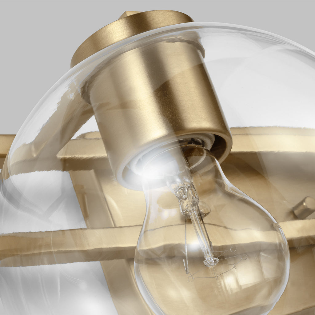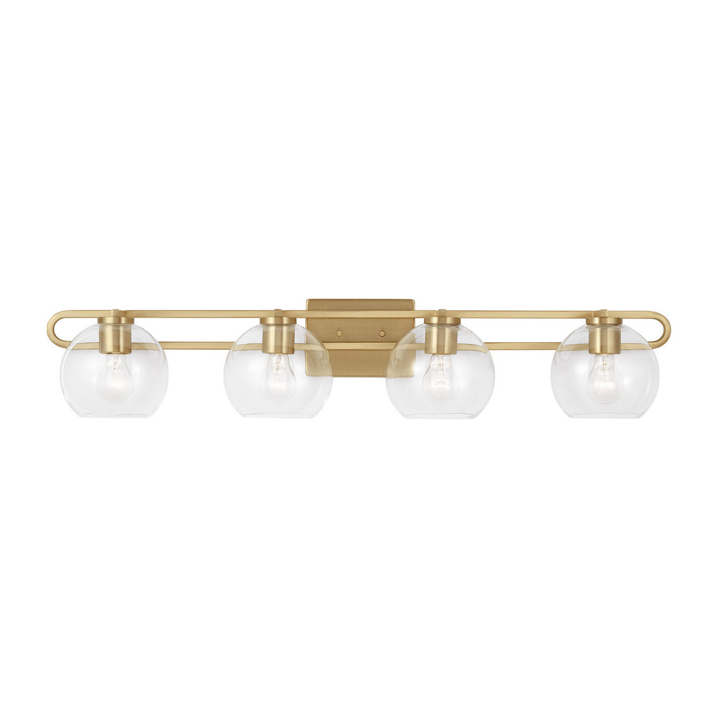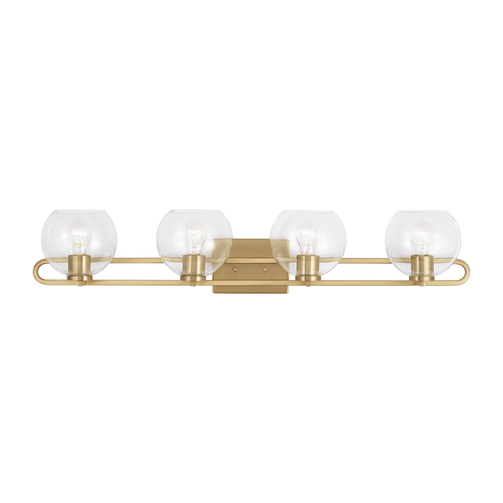 The Codyn four light vanity fixture in Satin Brass is a contemporary take on a classic mid-century design. Clear glass shades with open-ended spheres accent the elongated keyhole strap detail, for a clean look. This minimalist collection relies on subtle details to create visual interest​
