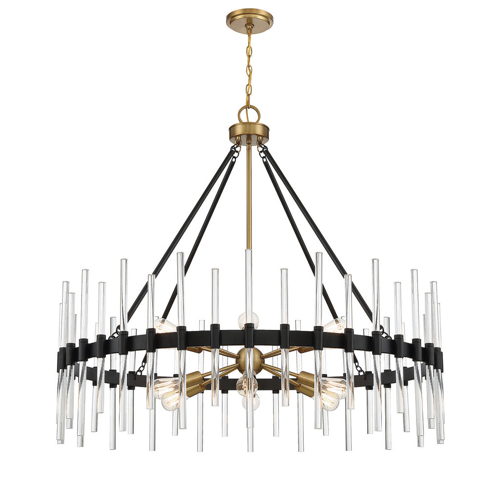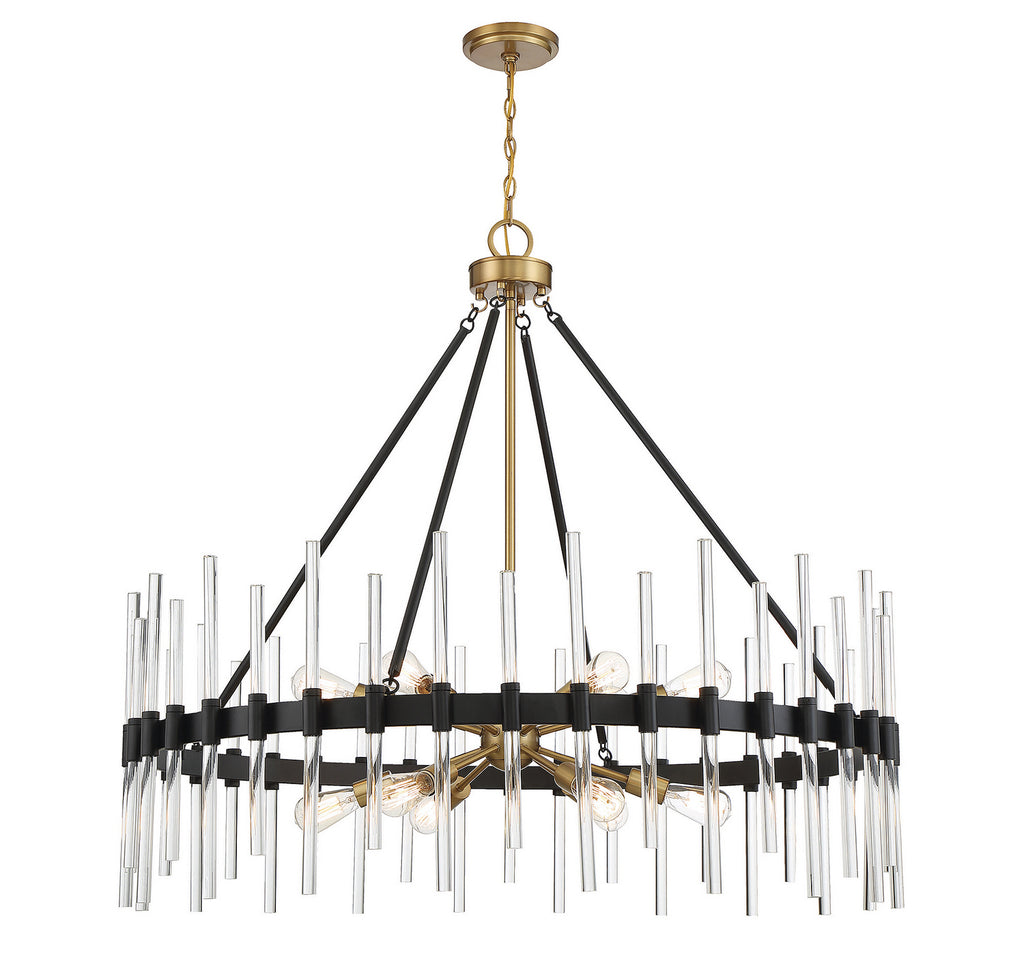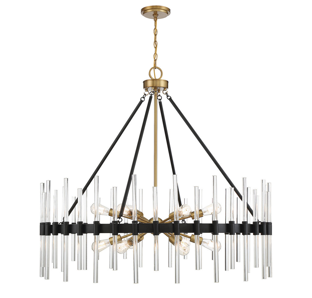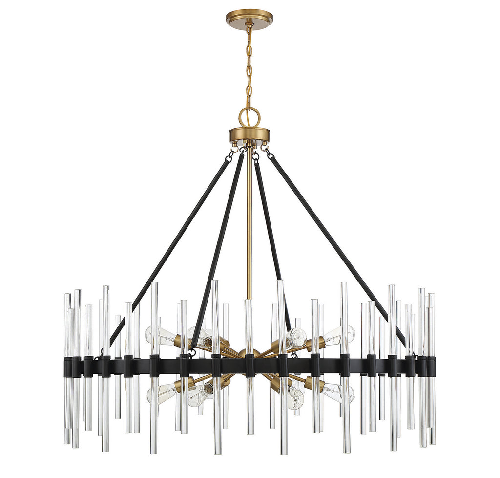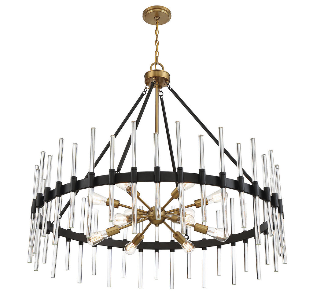 Classic, iconic Sputnik style meets chic, modern crystal details in the stylish large-scale Savoy House Santiago 12-light chandelier. Wands of crystal create a beautiful drum shade that allows for bright, unobscured light. The matte black finish is accentuated by warm brass for extra boldness. Santiago is 41" in height and 45" in diameter. It uses twelve standard size bulbs of up to 60 watts per bulb. Comes with 120" of chain and 144" of cord.