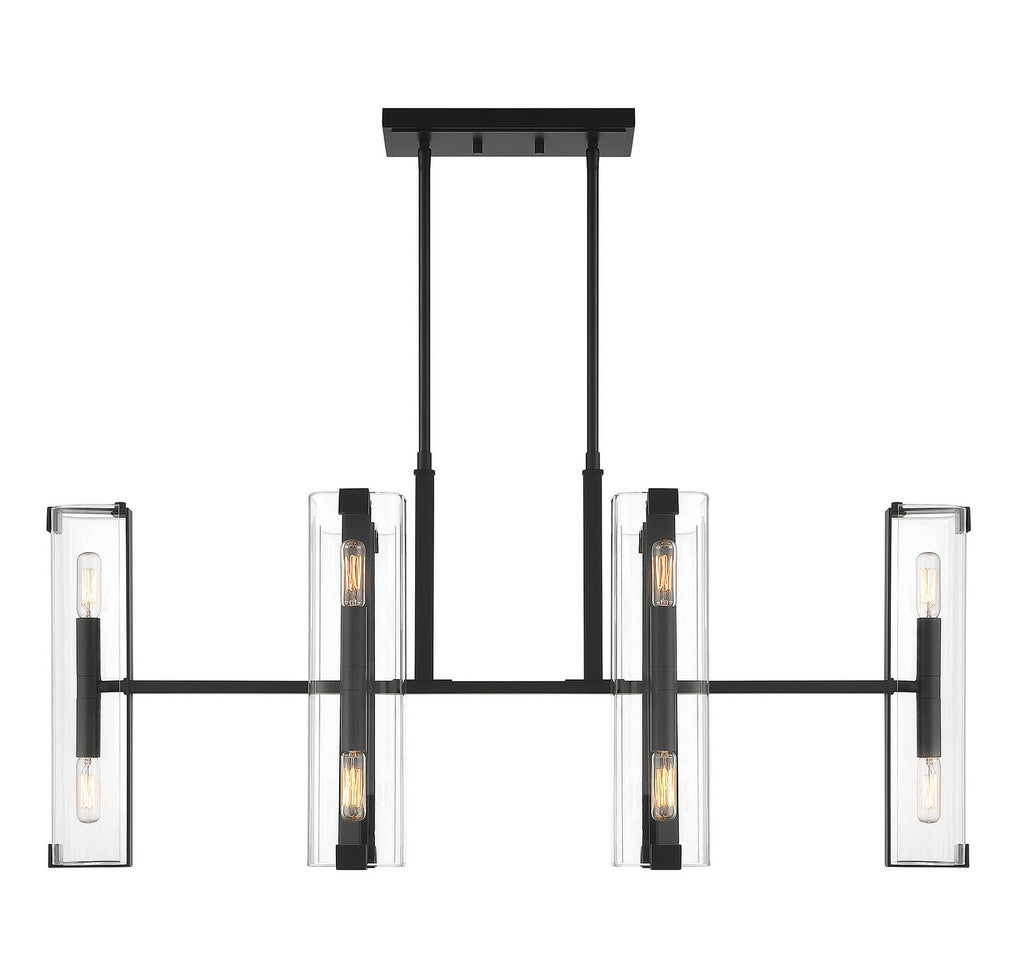 Sleek and sophisticated! The Savoy House Winfield 12-light linear chandelier has an eye-catching design, yet the clean lines and transparent glass keep the mood serene. Bold straight lines of the downrod, frame and bulb sockets are highlighted by the matte black finish. Each of the six light arms holds two 60W candelabra size bulbs, one facing up and one facing down, for splendid illumination through the pristine clear glass shades. This chandelier measures 38" long and has an adjustable height ranging from 23.25" to 69.75". Overall, it's a chic and stylish fixture for your dining room, living room, entryway, kitchen island, family room, bar, office or media room.